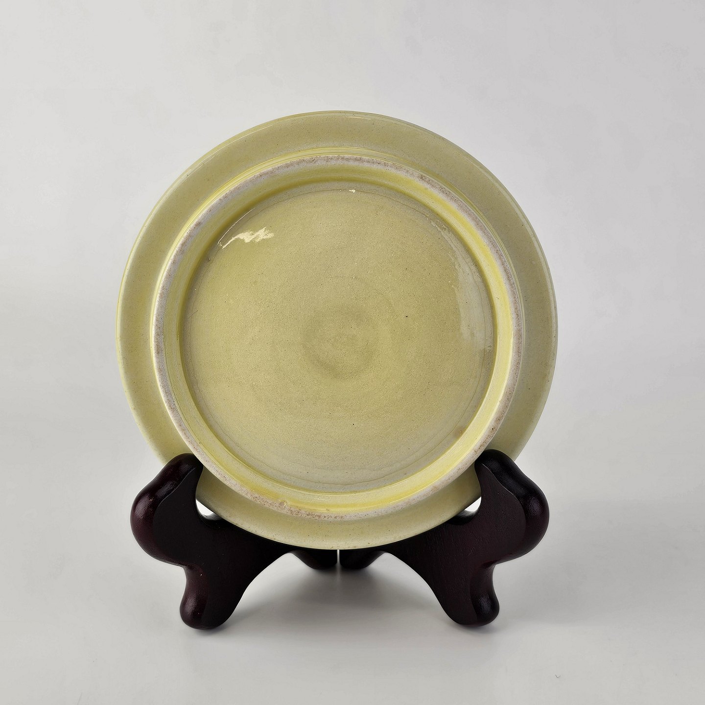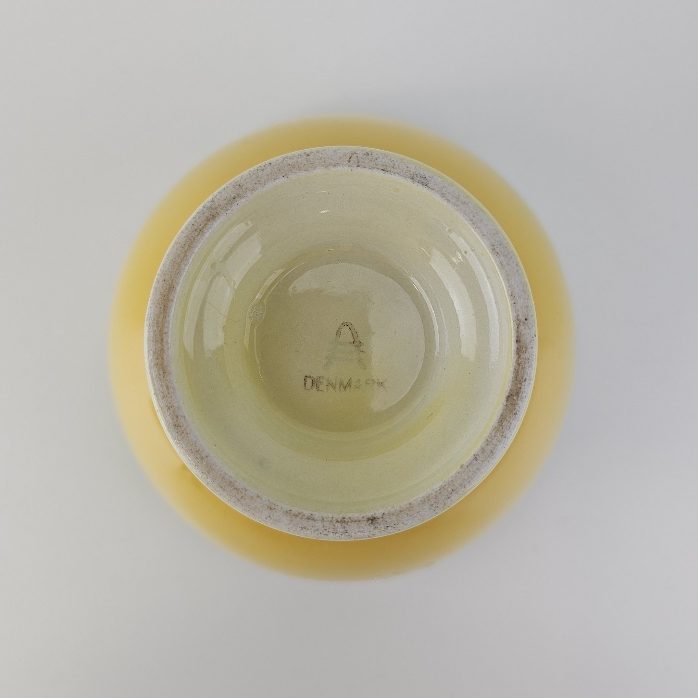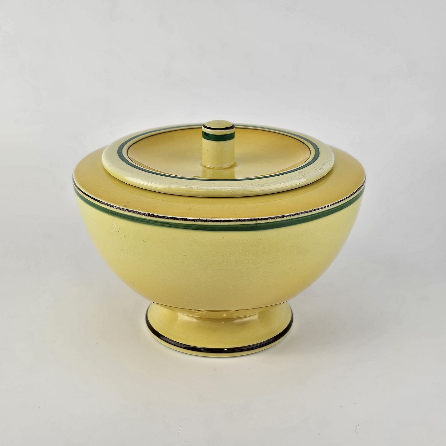 Fajancestel i stelform C med dekoration i gule nuancer med grøn stribe.