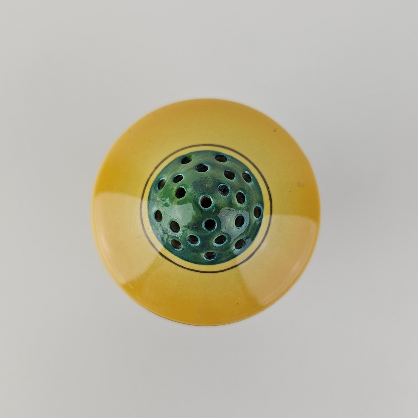 Fajancestel i stelform C med dekoration i gule nuancer med grøn stribe.
