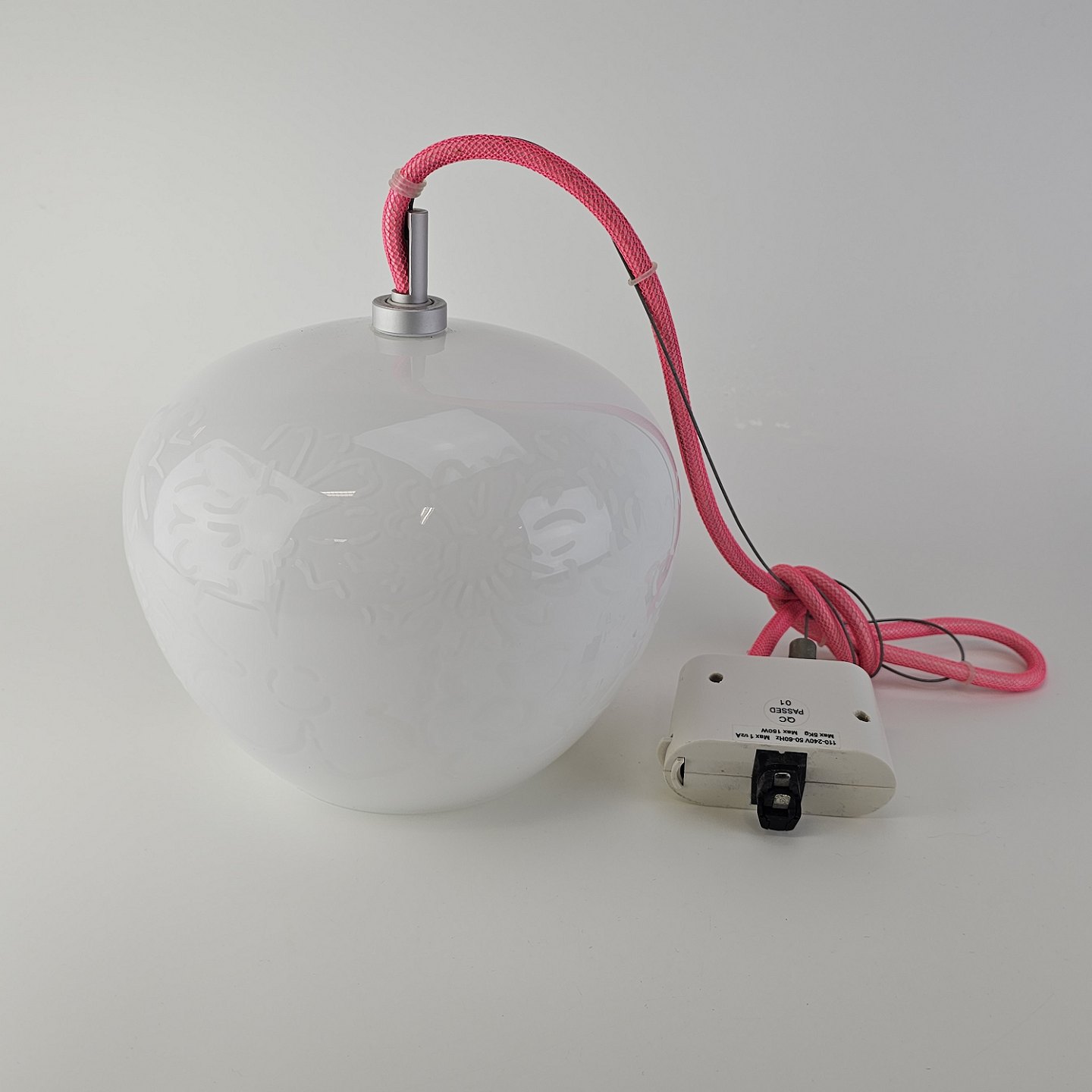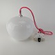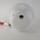 Pendel i hvidt mundblæst glas med blomstermotiver og monteret med lyserød ledning