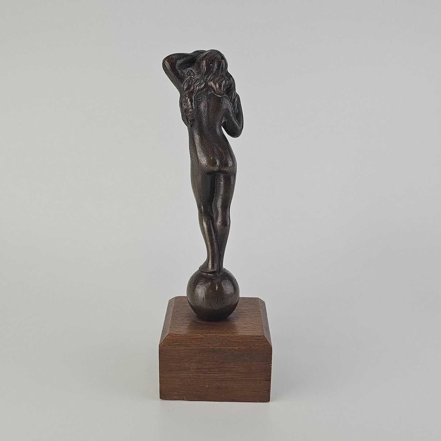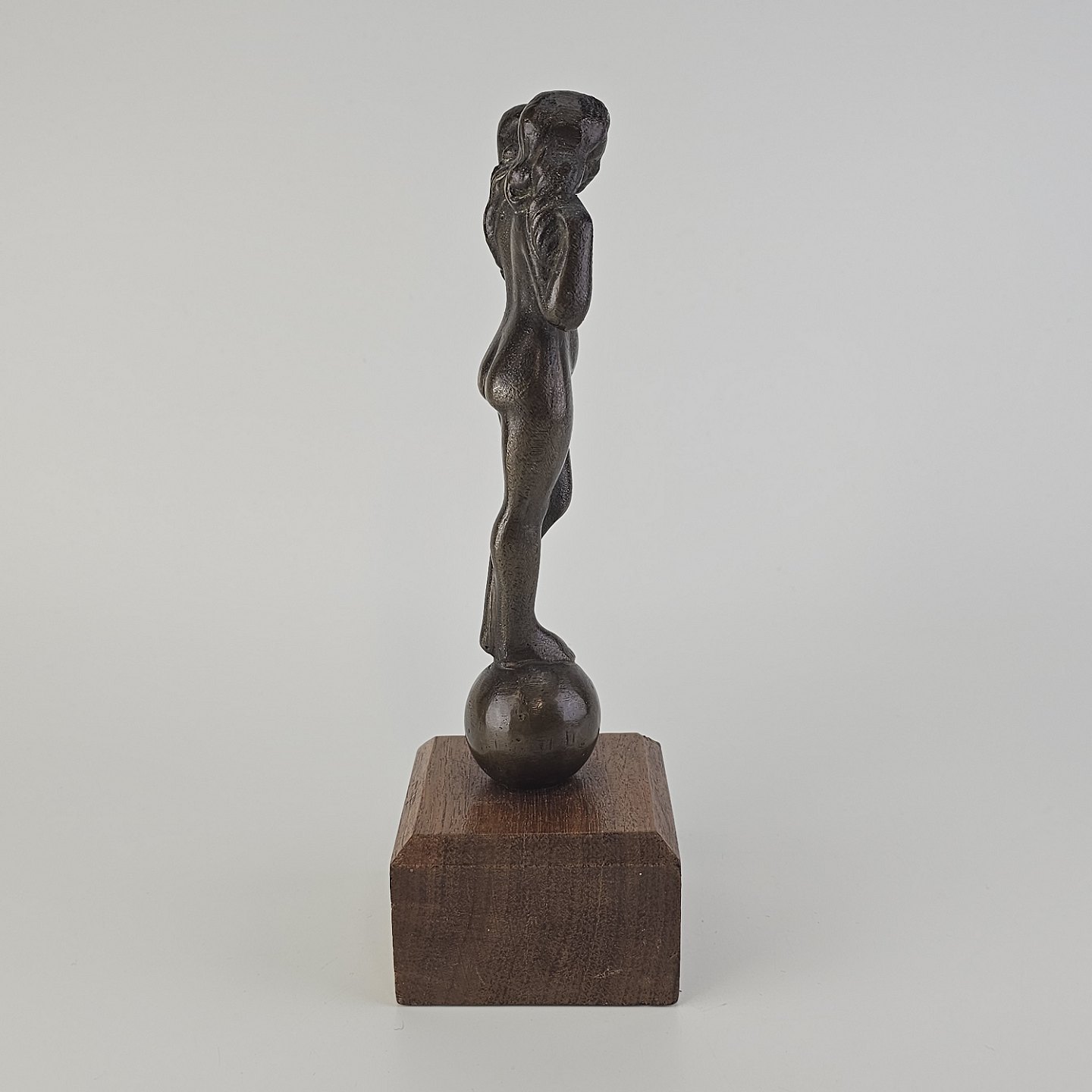 Figur med motiv af en kvinde på træsokkel, bruneret messing