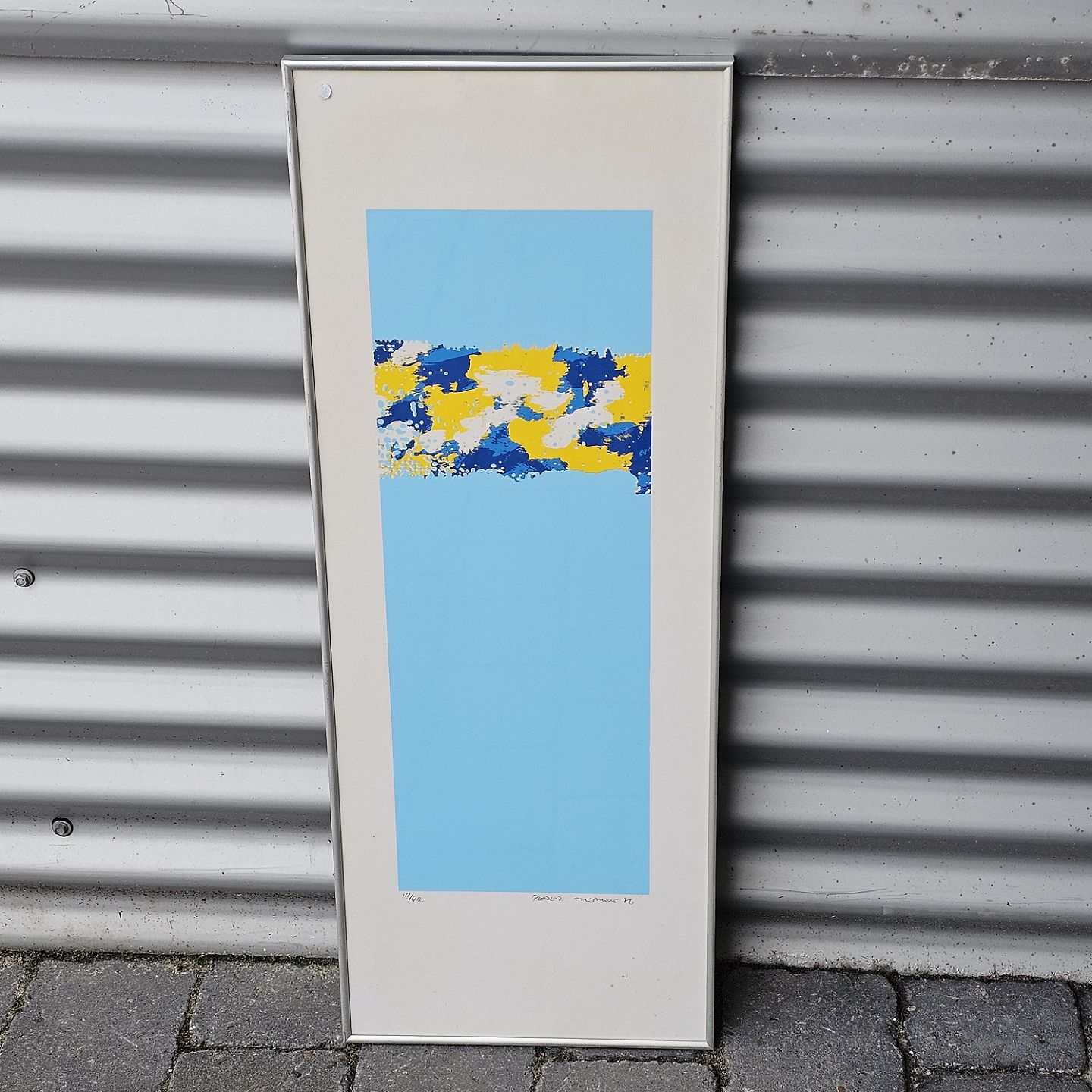 Litografi med blå, hvide og gule farver på lyseblå baggrund i metal ramme. 13/92