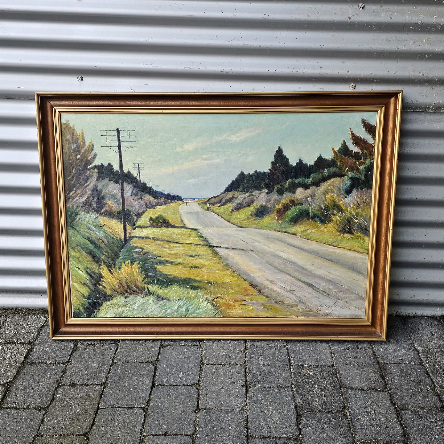 Oliemaleri på lærred med titlen Blokhus. Monteret i guldramme med motiv af landevejen til Blokhus