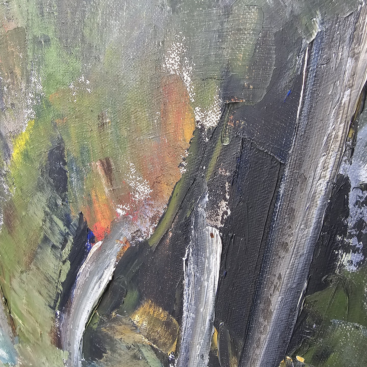 Oliemaleri på lærred med titlen Tisvilde Hegn. Monteret i sortmalet ramme med abstrakt naturmotiv, dateret 1960