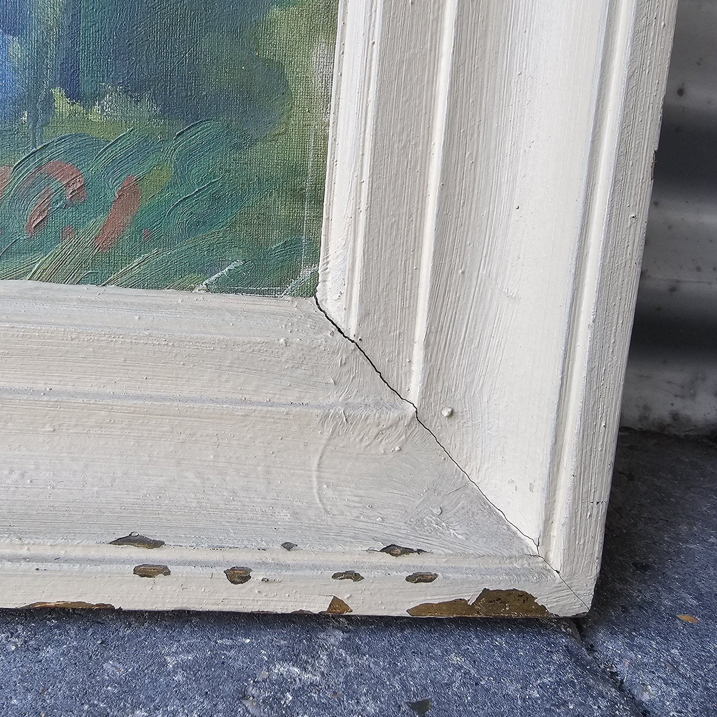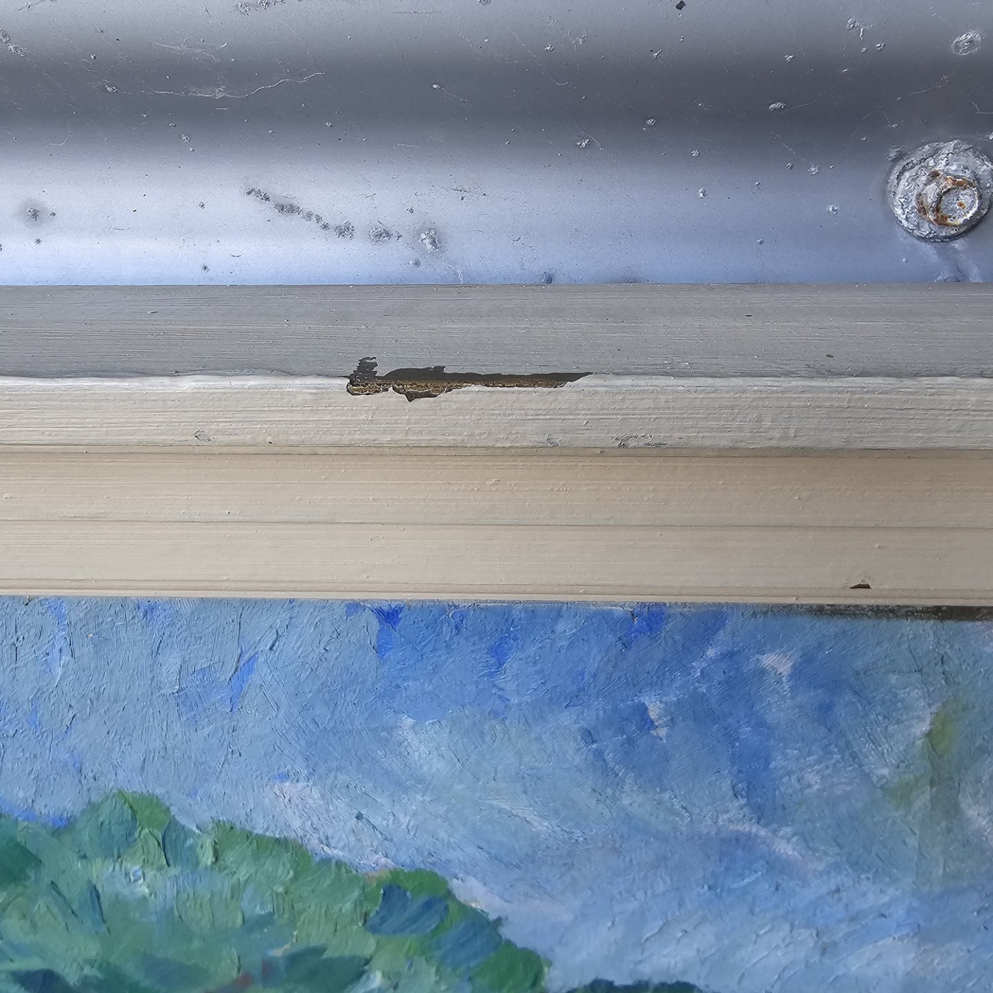 Fremstår med afslag i malingen på rammen og er monteret en smule løst