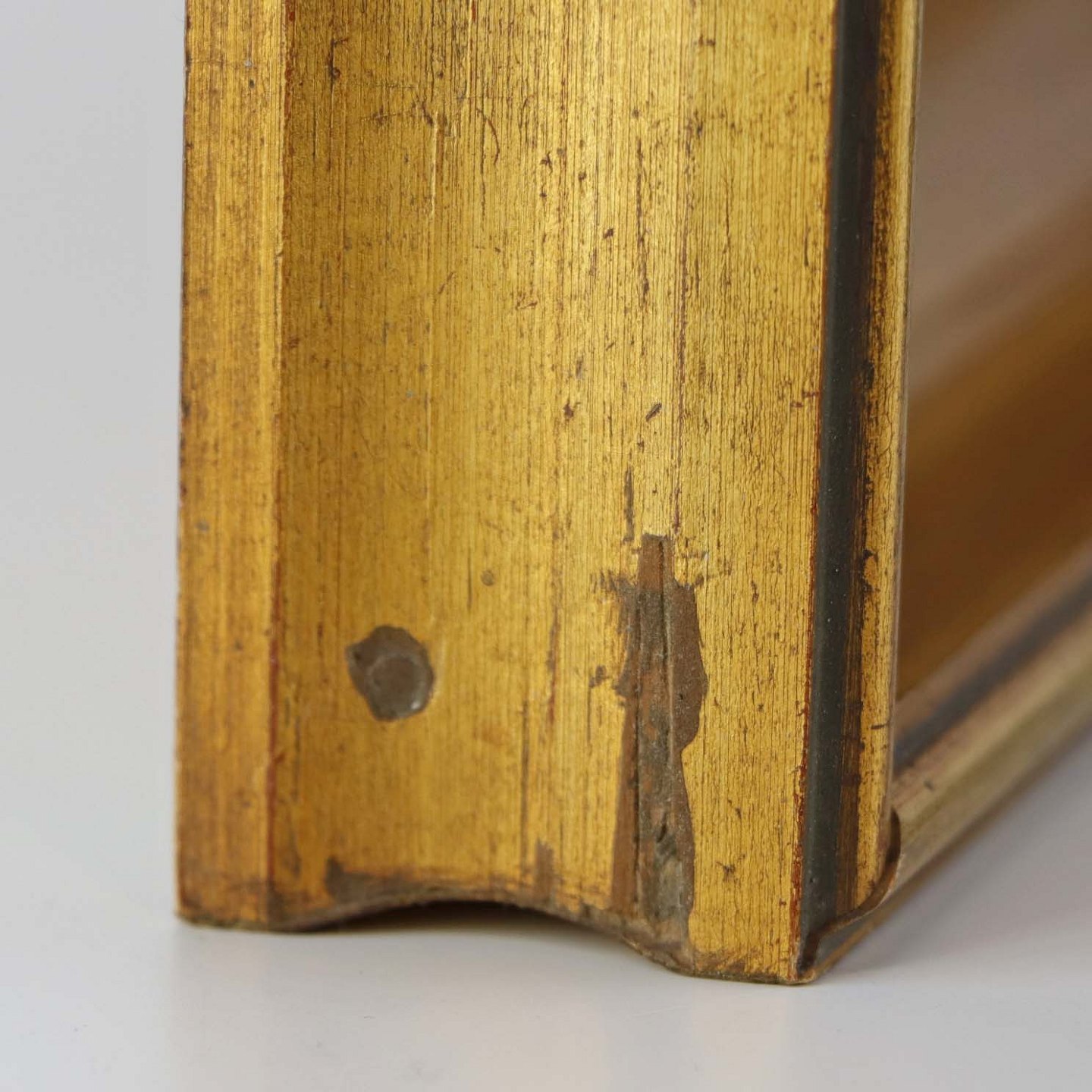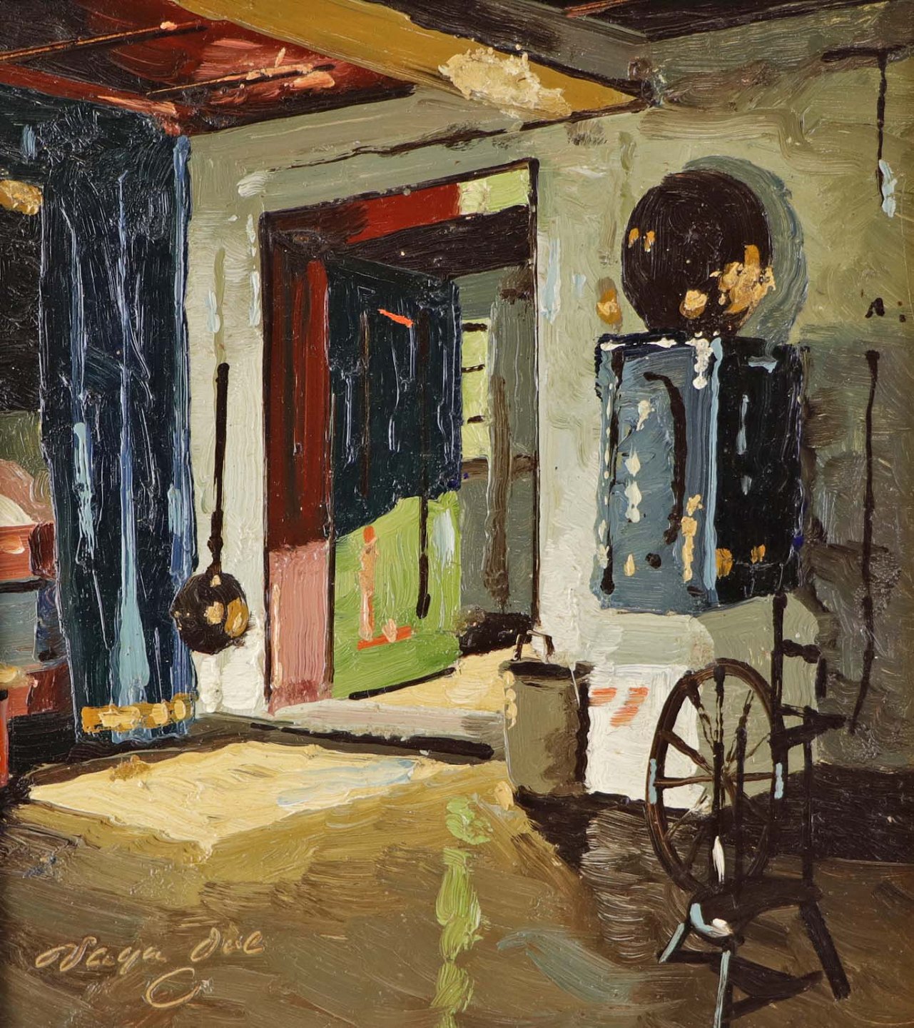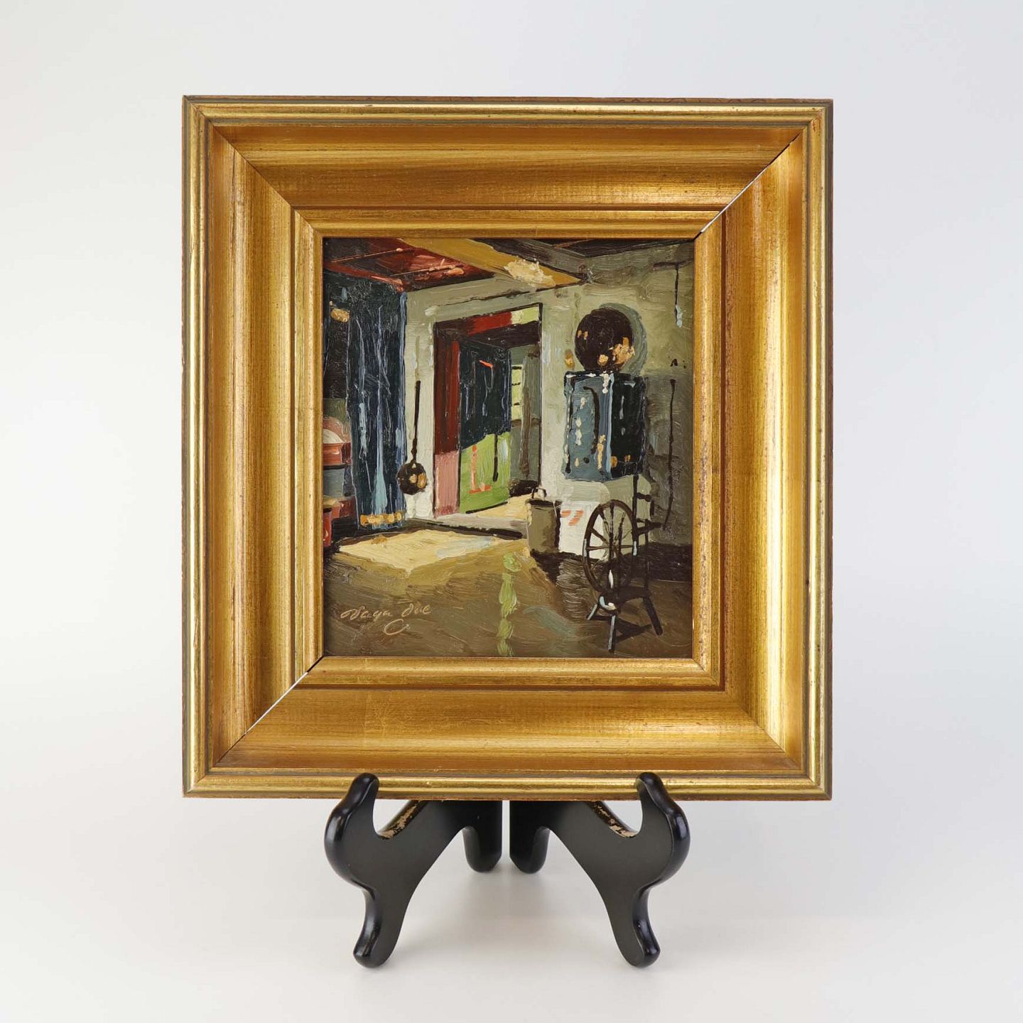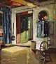 Maleri på plade i guldmalet træramme med med ældre interiør motiv fra dansk bondehus.