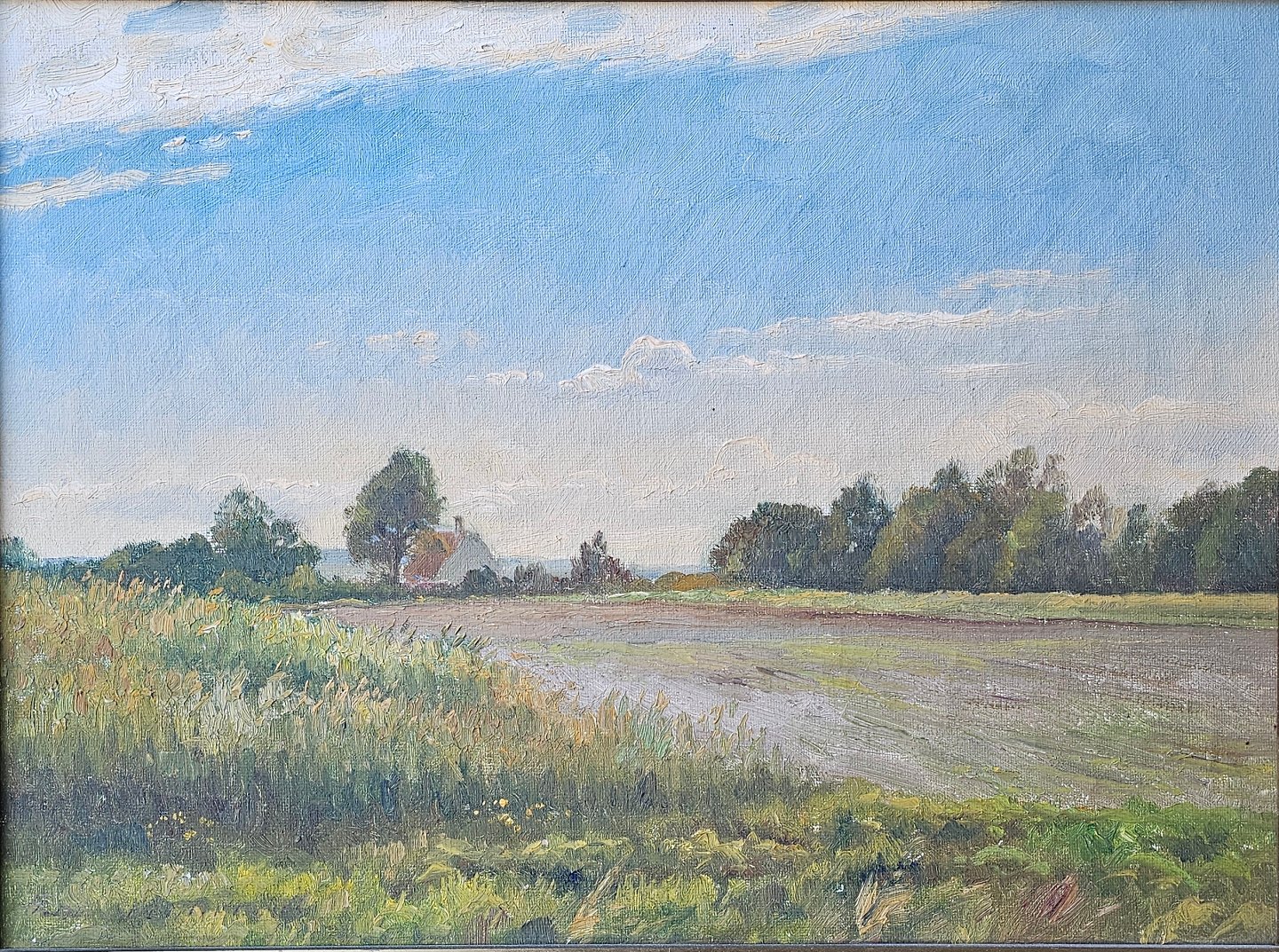 Oliemaleri på lærred monteret i bred træramme med landskabsmotiv