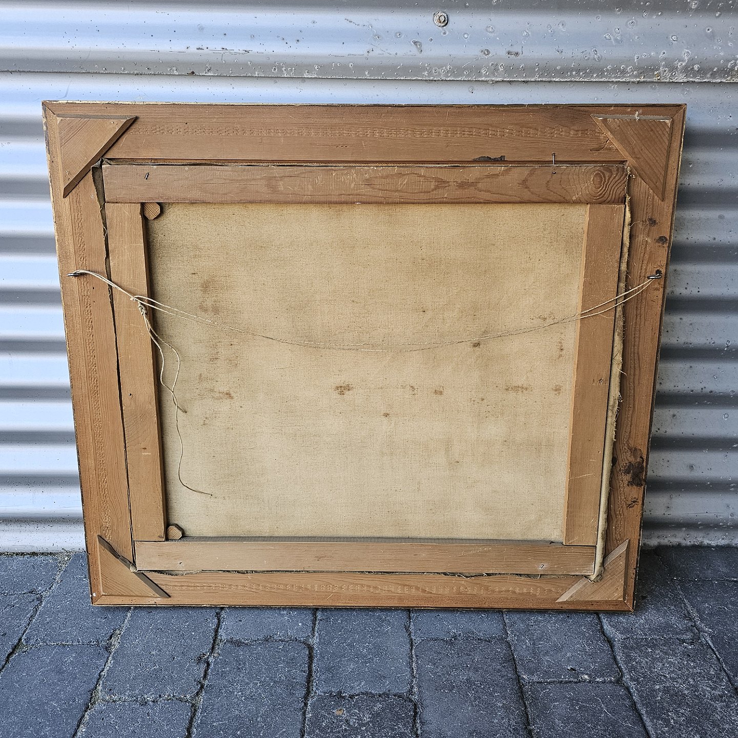 Oliemaleri på lærred monteret i guldramme med motiv af to børn på en landsbyvej