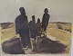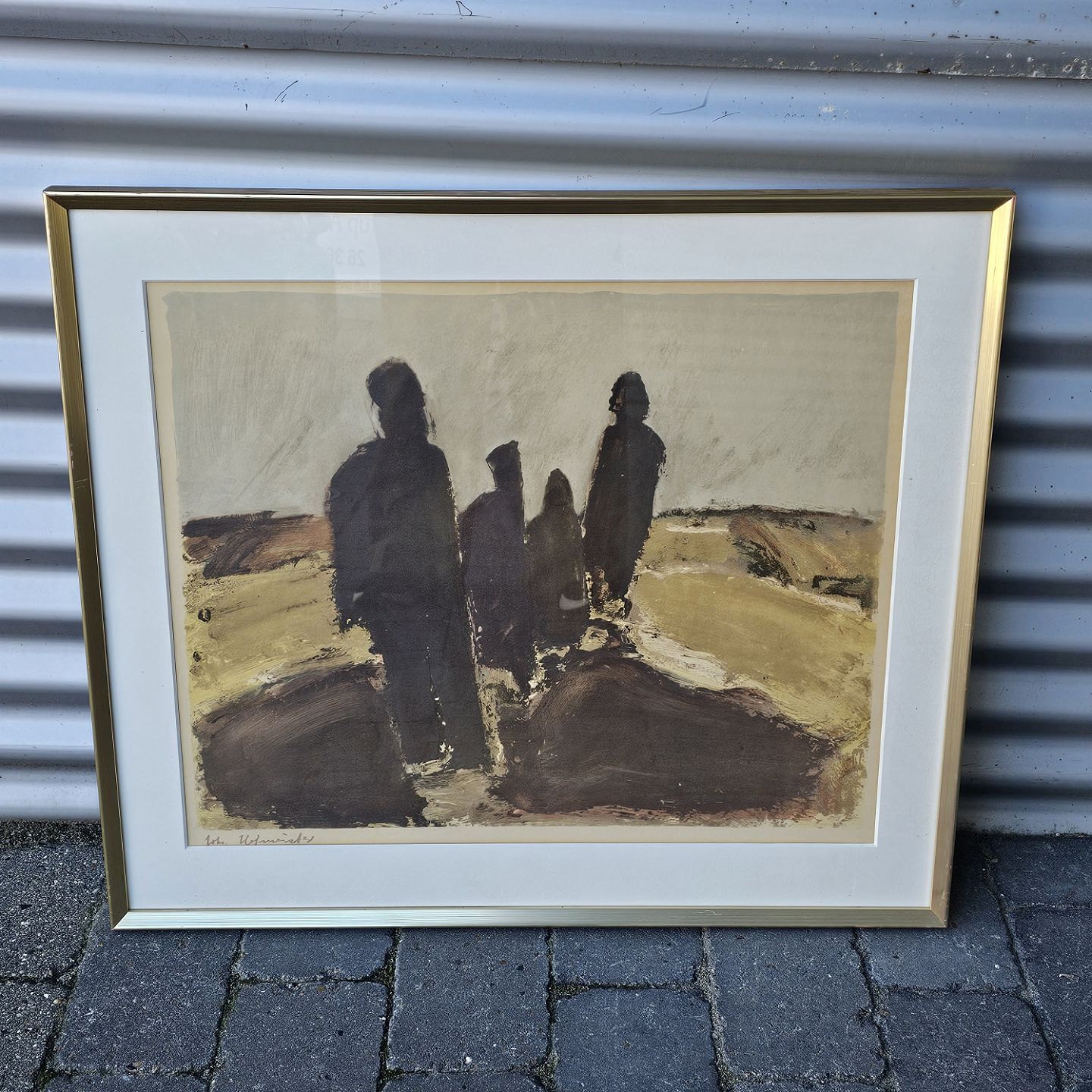 Litografi med motiv af mennesker på en hede monteret i guldmalet træramme