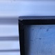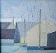 Struktureret oliemaleri på plade med motiv af huse monteret i sortmalet træramme