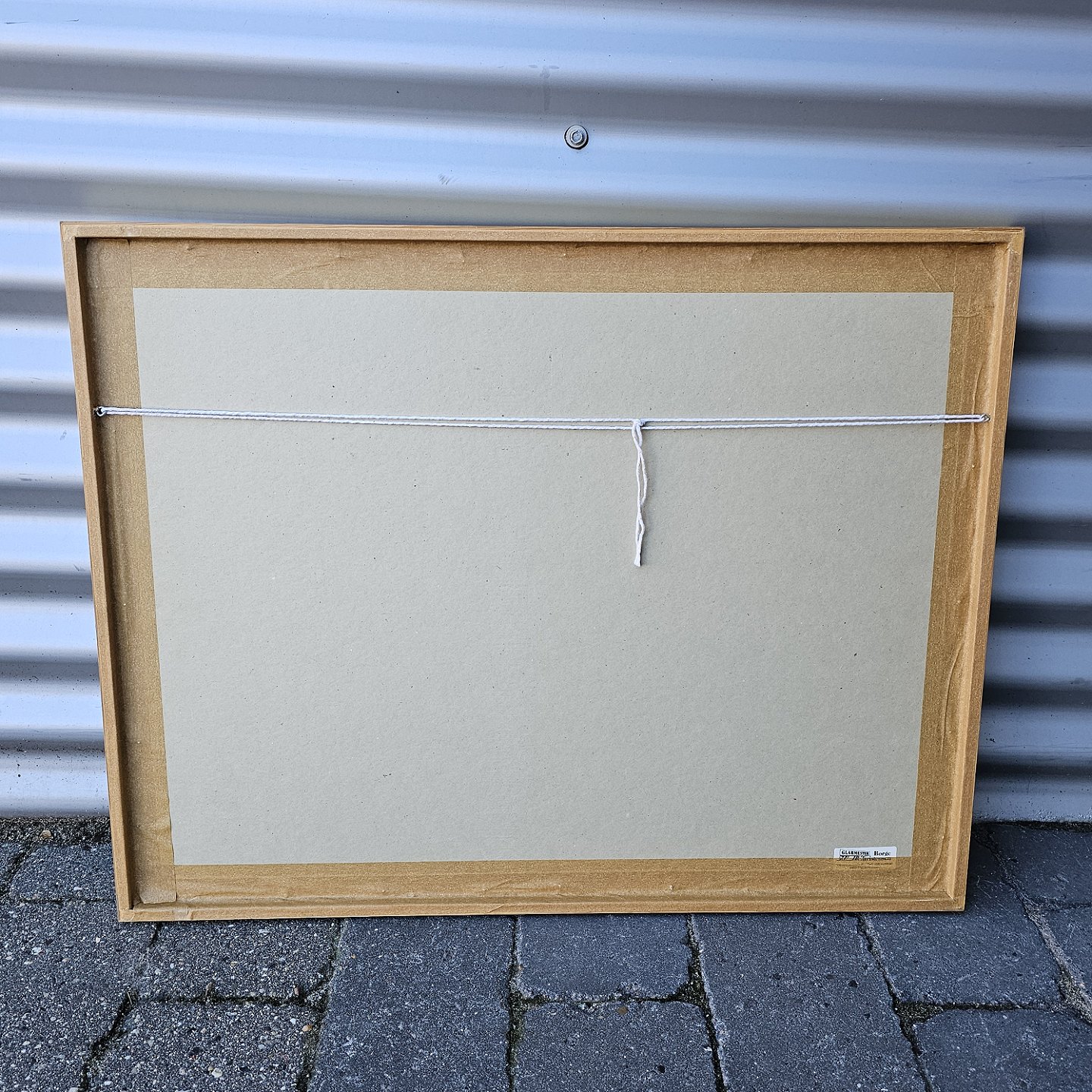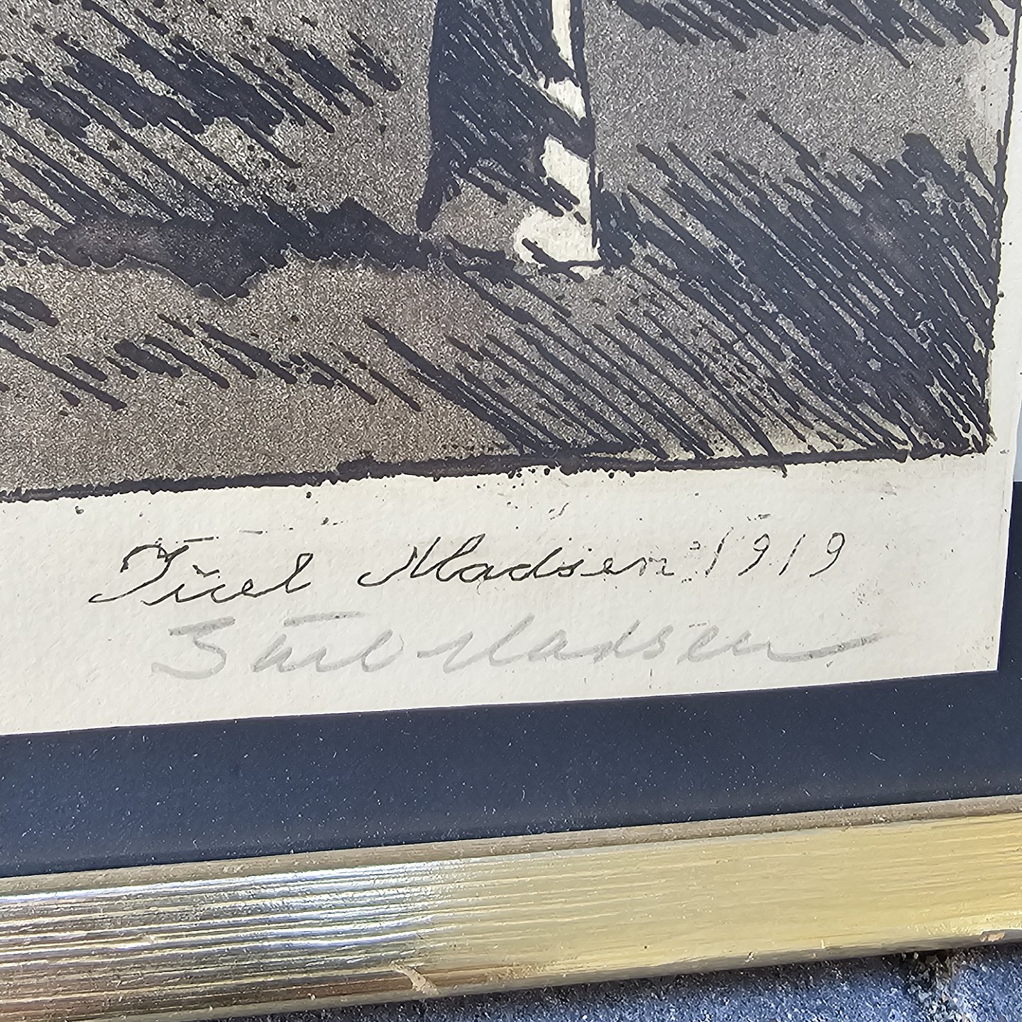Litografi med motiv af tre jægere og en hund monteret i guldmalet træramme. Nr. 94/100, dateret 1919