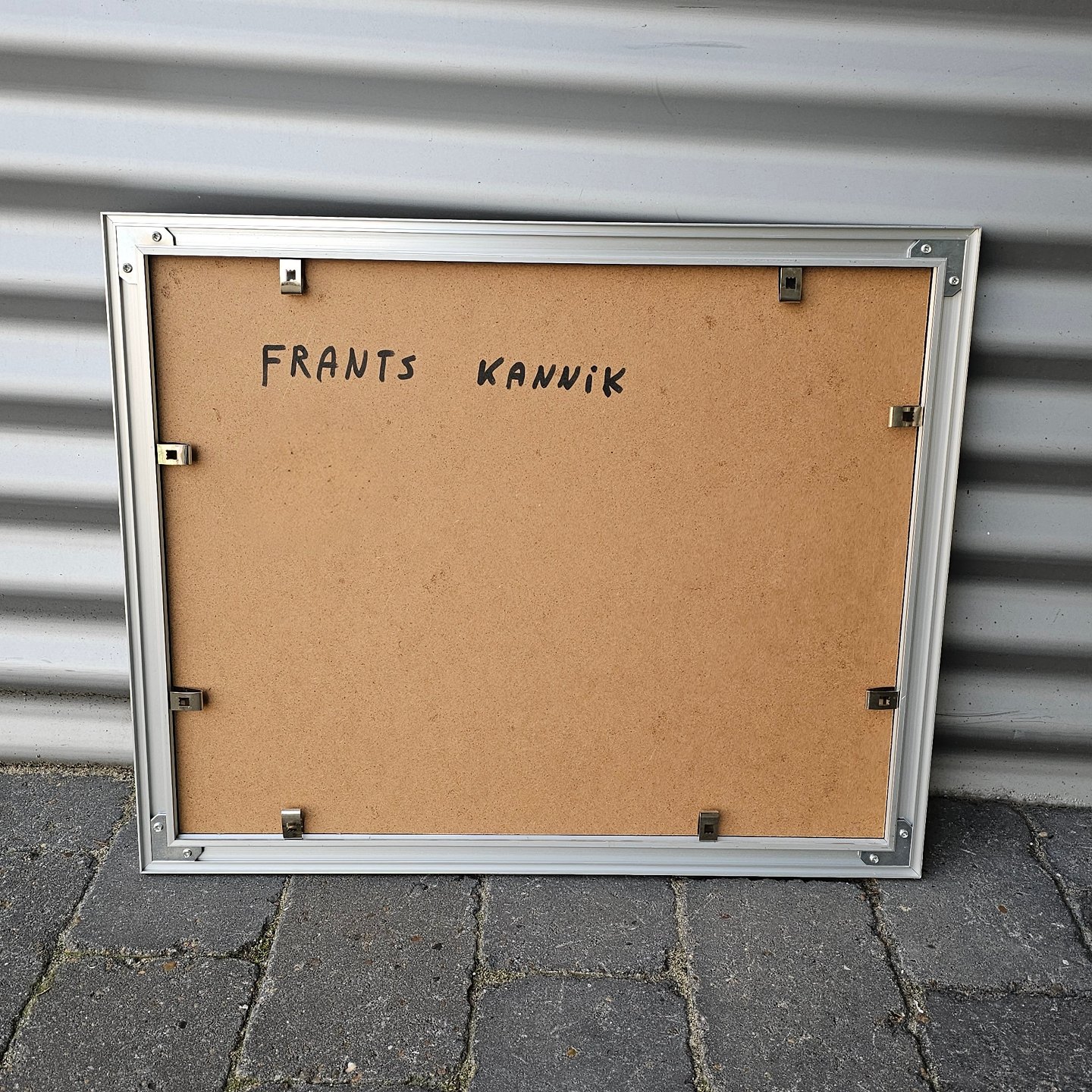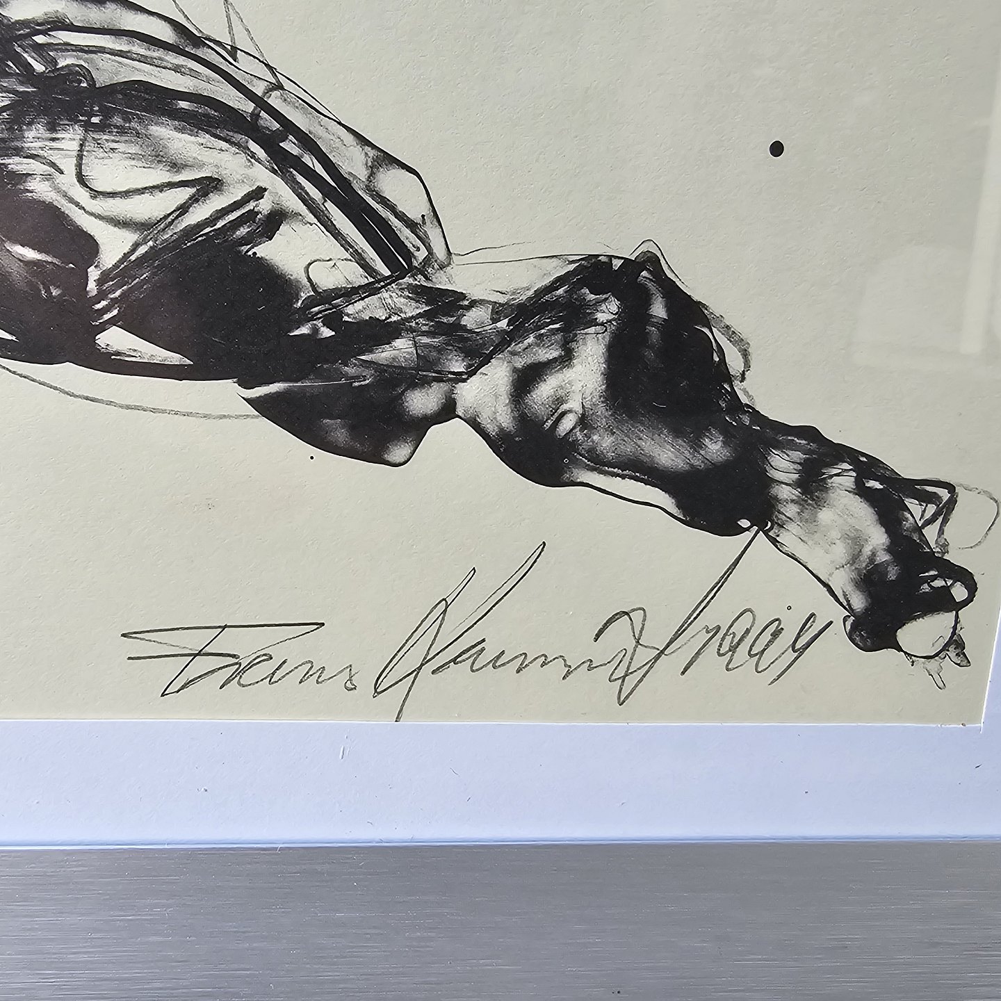 Akvaral på papir med abstrakt motiv af to mennesker i sort og grå. Monteret i sølvramme