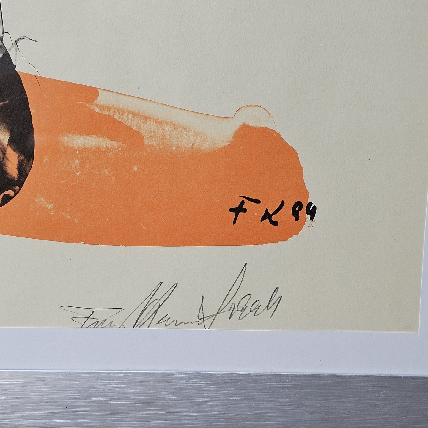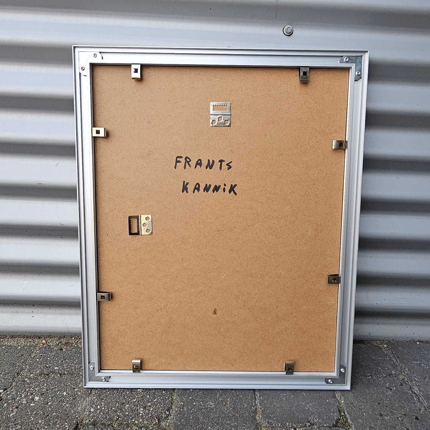 Akvaral på papir med abstrakt motiv af to mennesker i sort og gul. Monteret i sølvramme