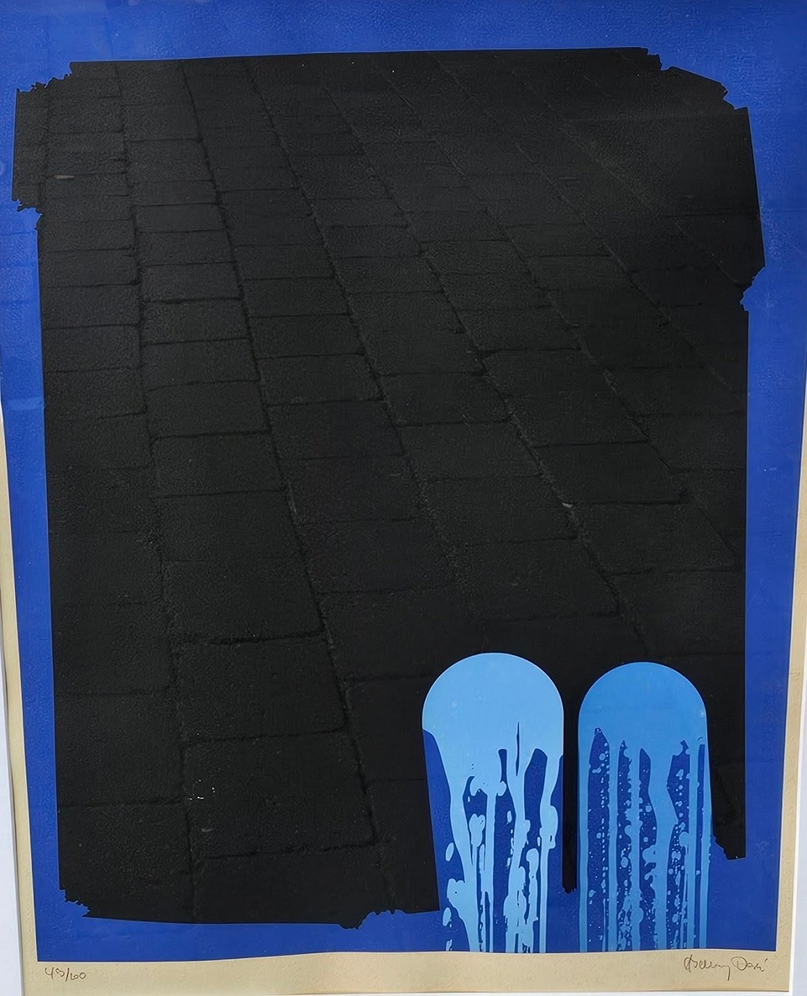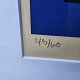 Litografi med abstrakt motiv i sort og blå monteret i sølvramme