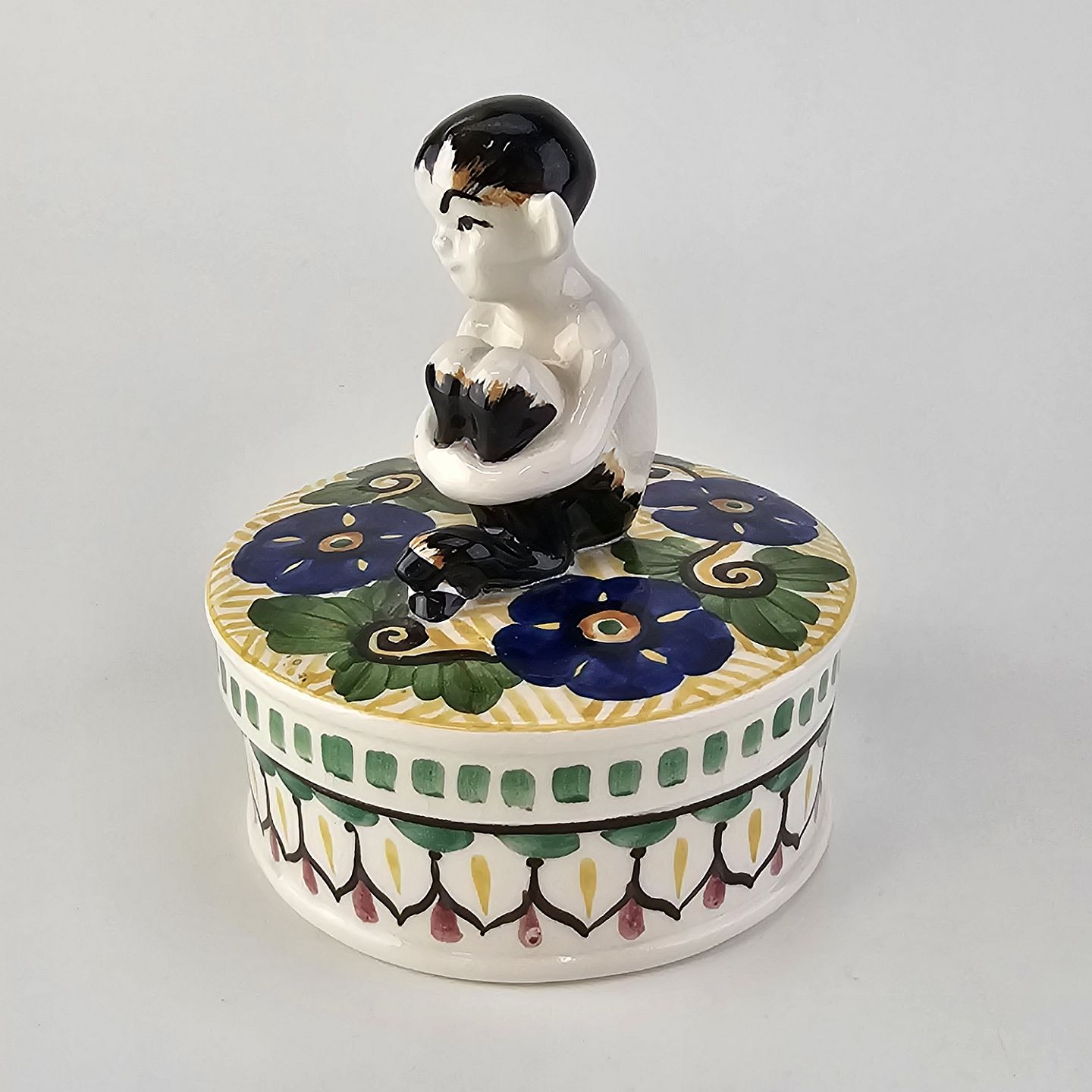Krukke med låg i fajance med dekoration af blomster og en figur af en faun på låget