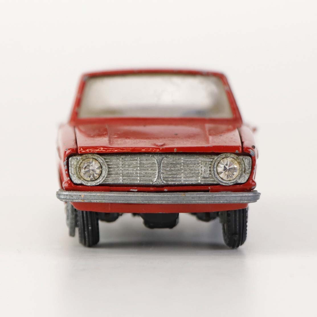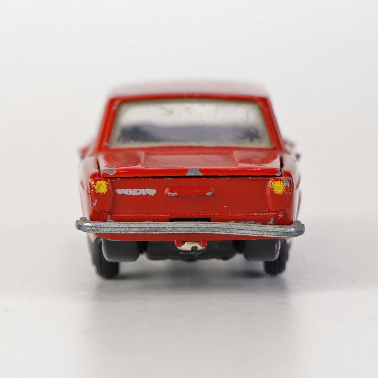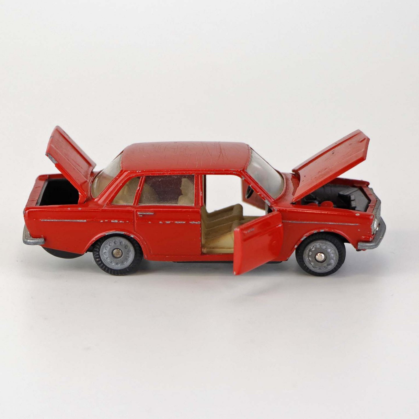 Sedan legetøjsbil i rødlakeret metal med gummi hjul. Model Volvo 144