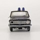 Politibil med to blinklys. Legetøjsbil i sortlakeret metal med gummi hjul og blå blinklys. Model Volvo 144