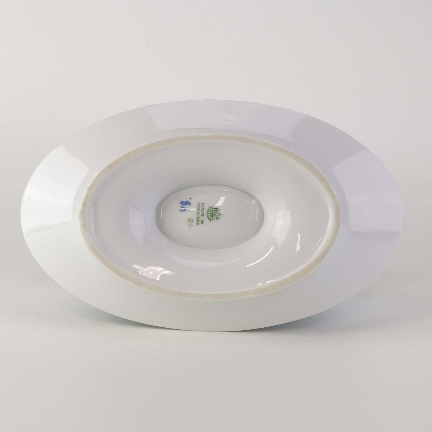 Fremstår med enkelte steder med en svag blå farve under glasuren på indvendig side.