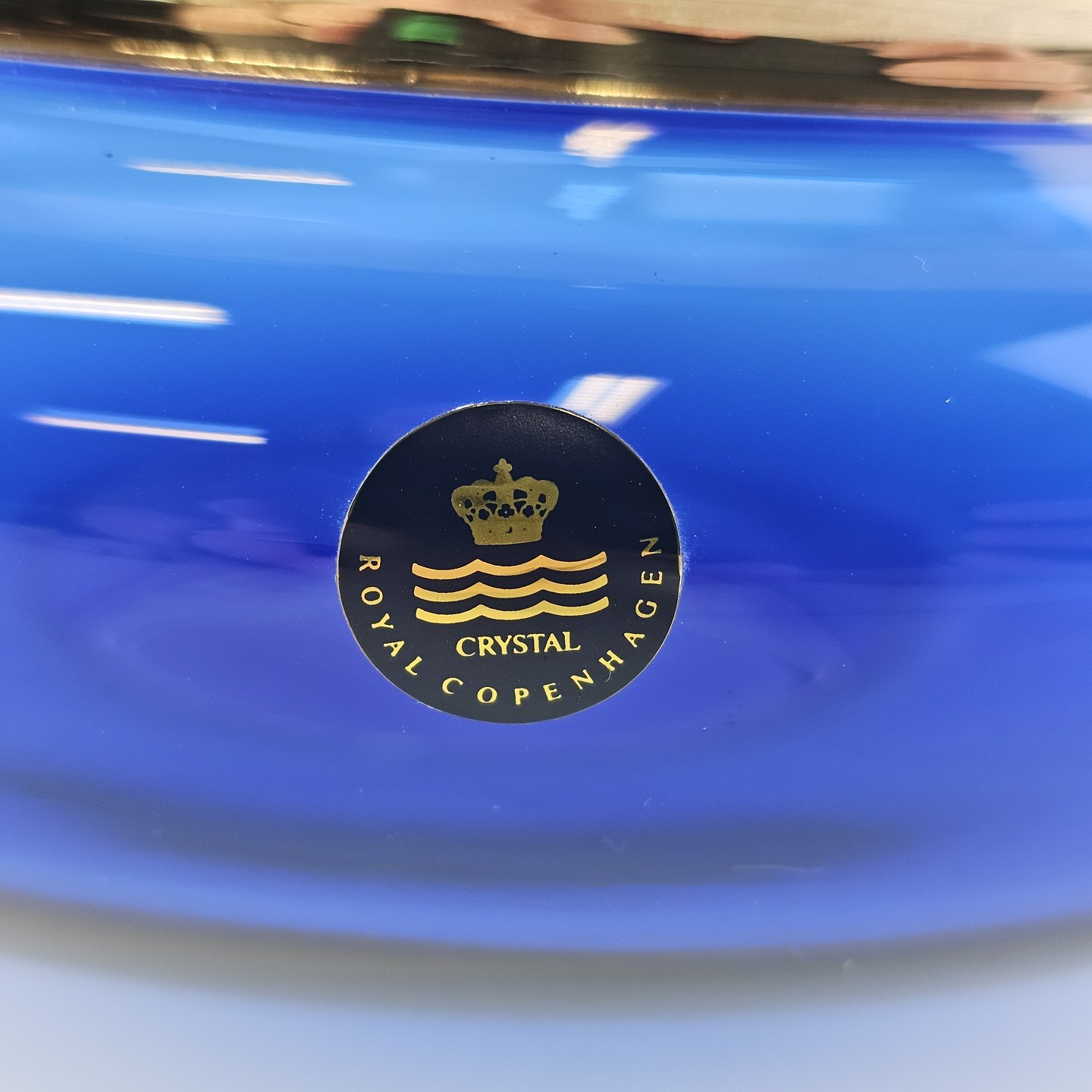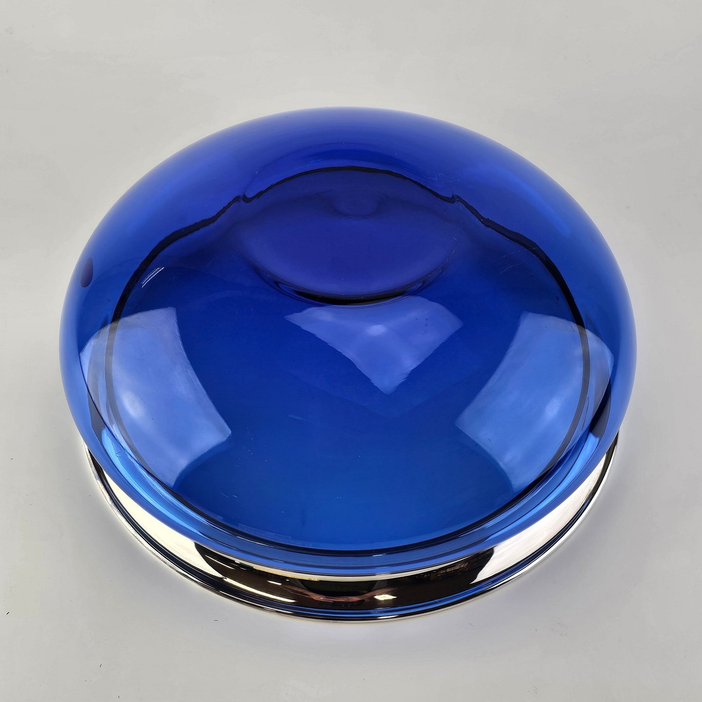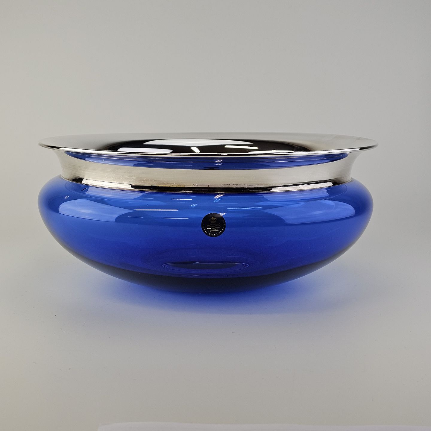 Mundblæst skål i blåt krystalglas med kant dyppet i sølv, fra serien Saturn