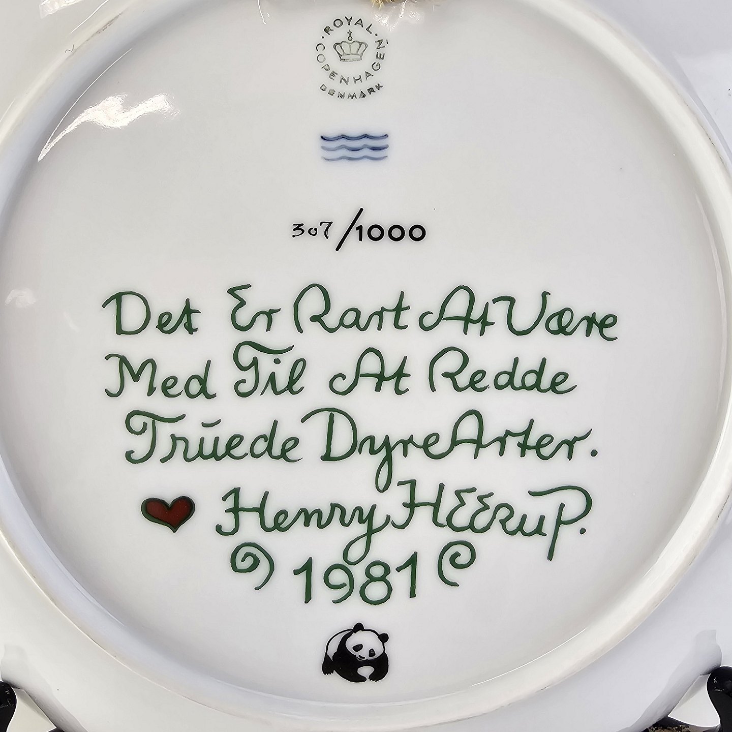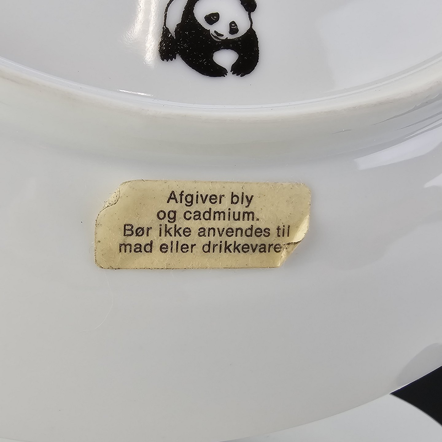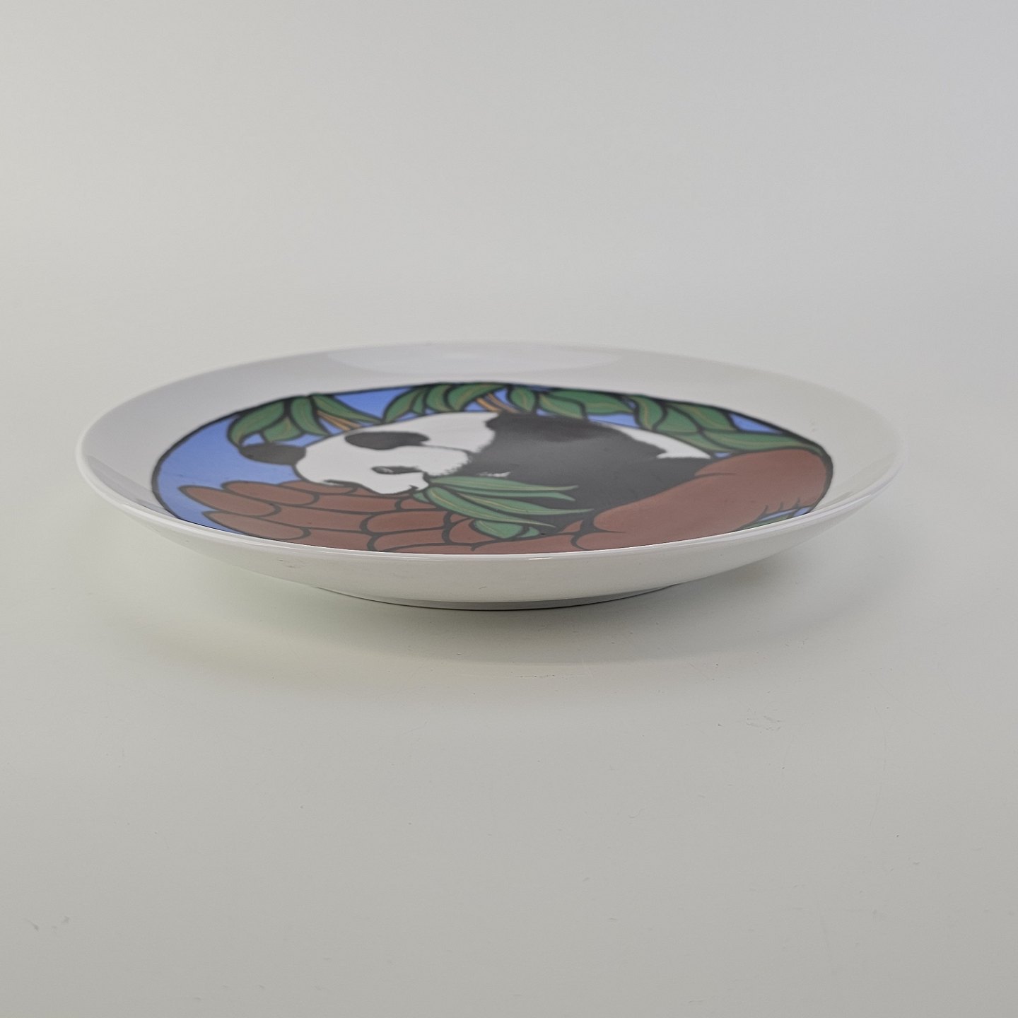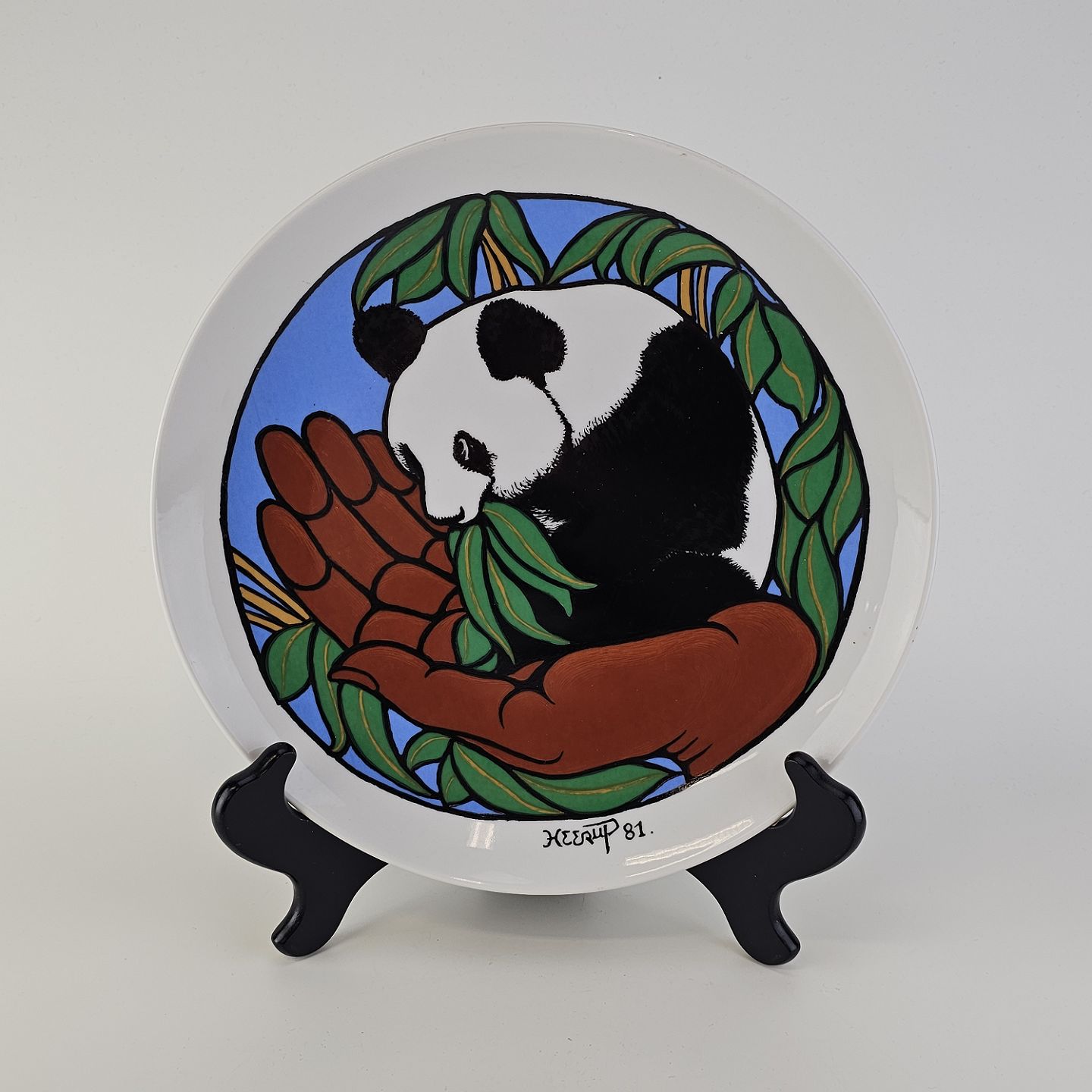 Platte af kongeligt porcelæn med motiv af en panda, som sidder i en åben hånd. Nr. 307/1000