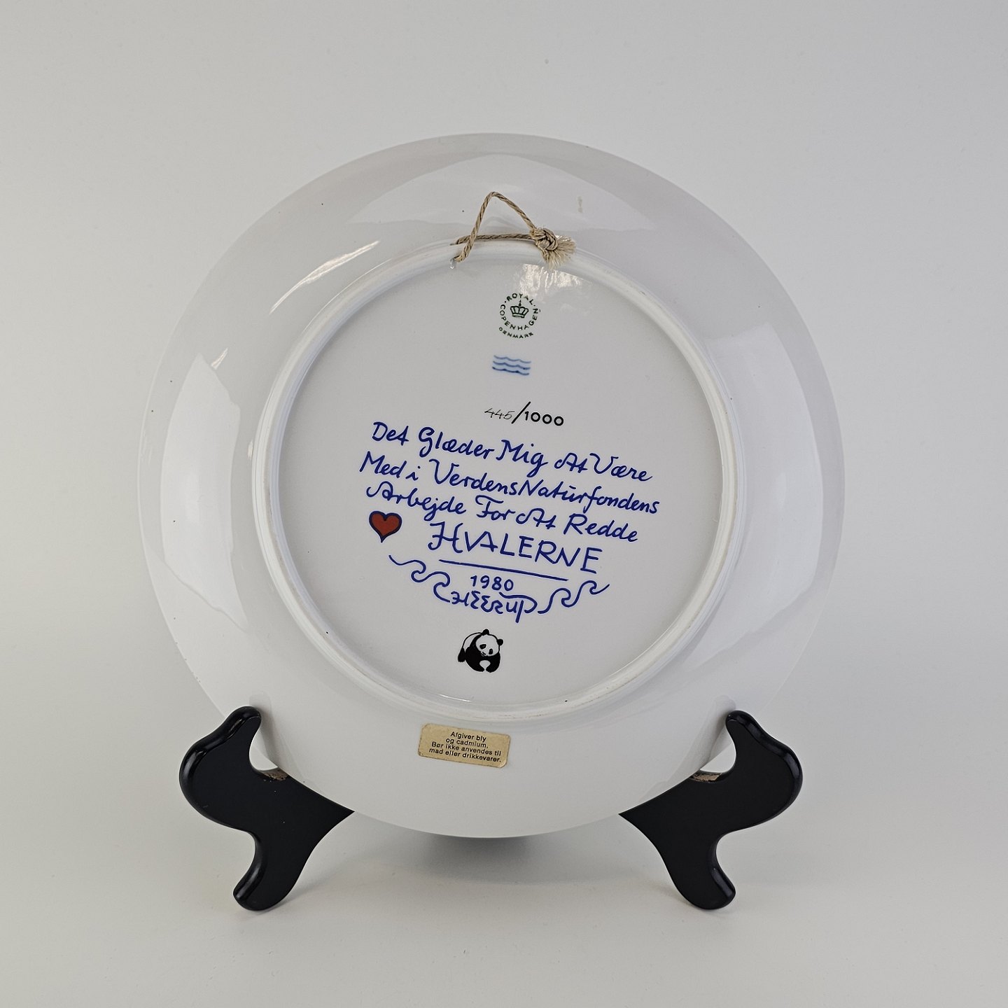 Platte af kongeligt porcelæn med motiv af to hvaler i rød og blå nuancer. Nr. 445/100