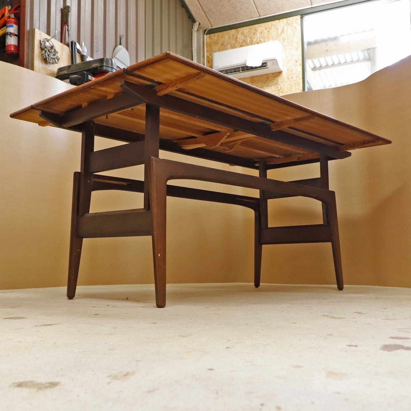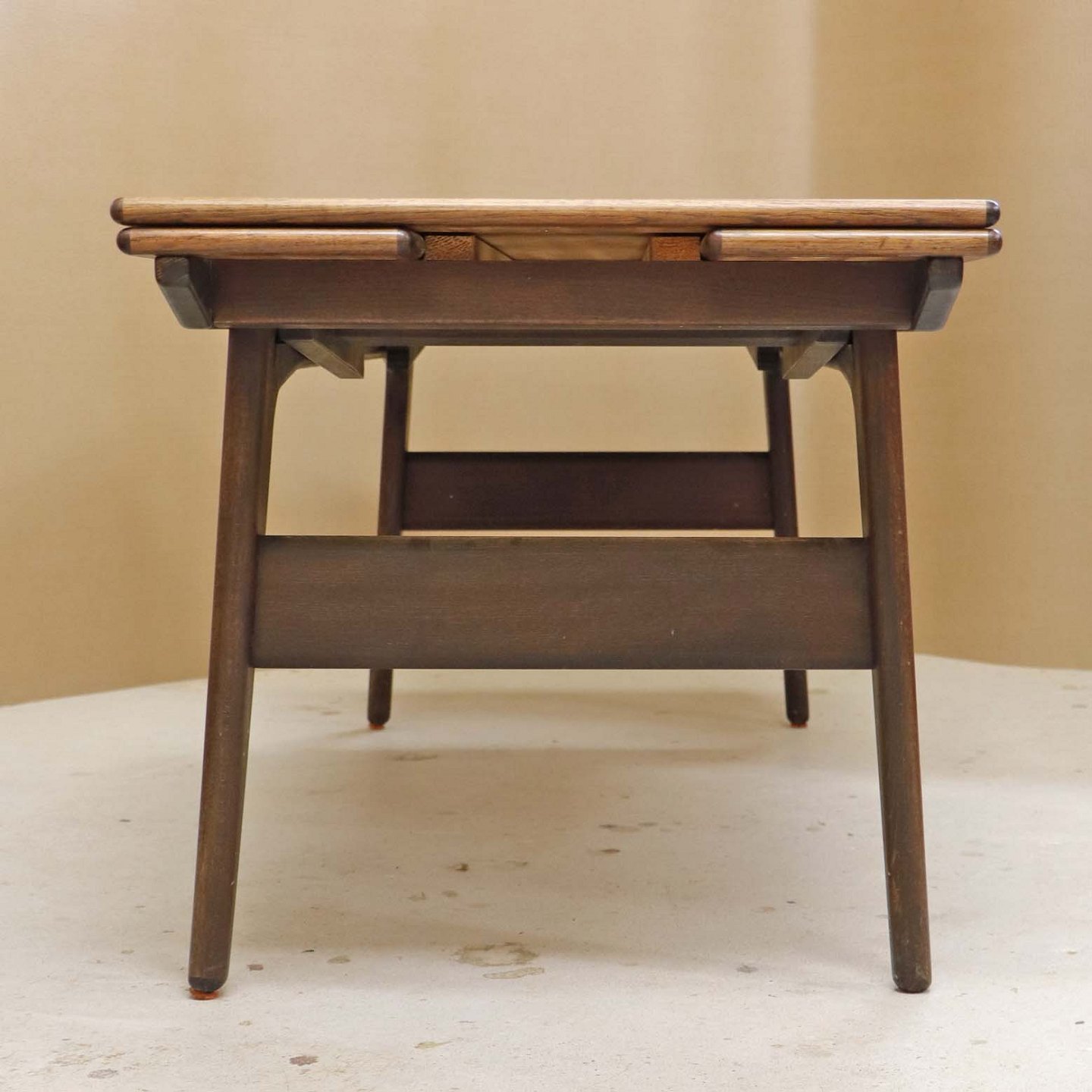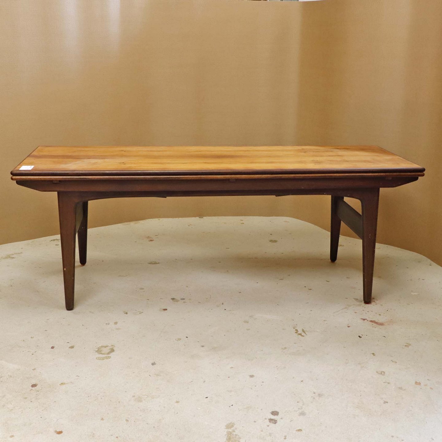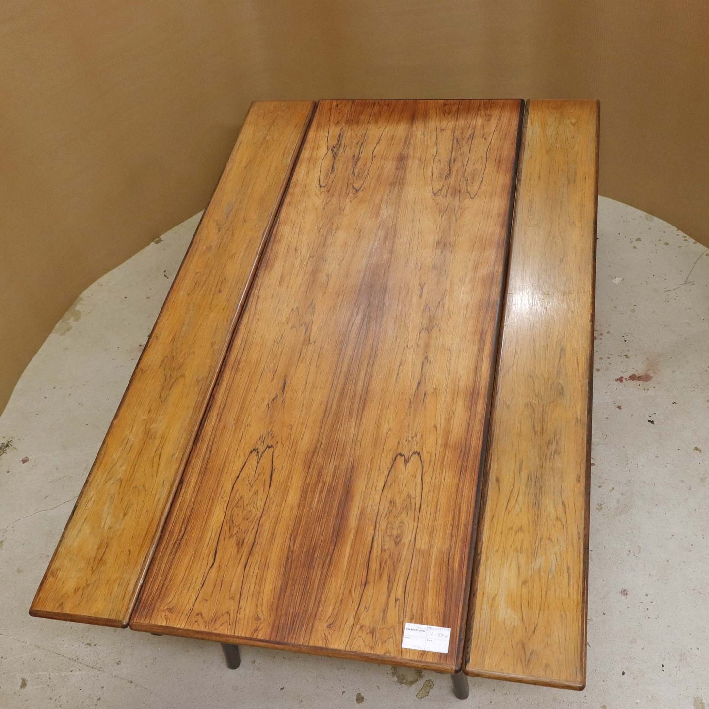 Sofa- og spisebord i samme møbel. Bordet er fremstillet i lakeret palisander og har to underliggende udtræksplader, som befinder sig på hver af bordets lang-sider.