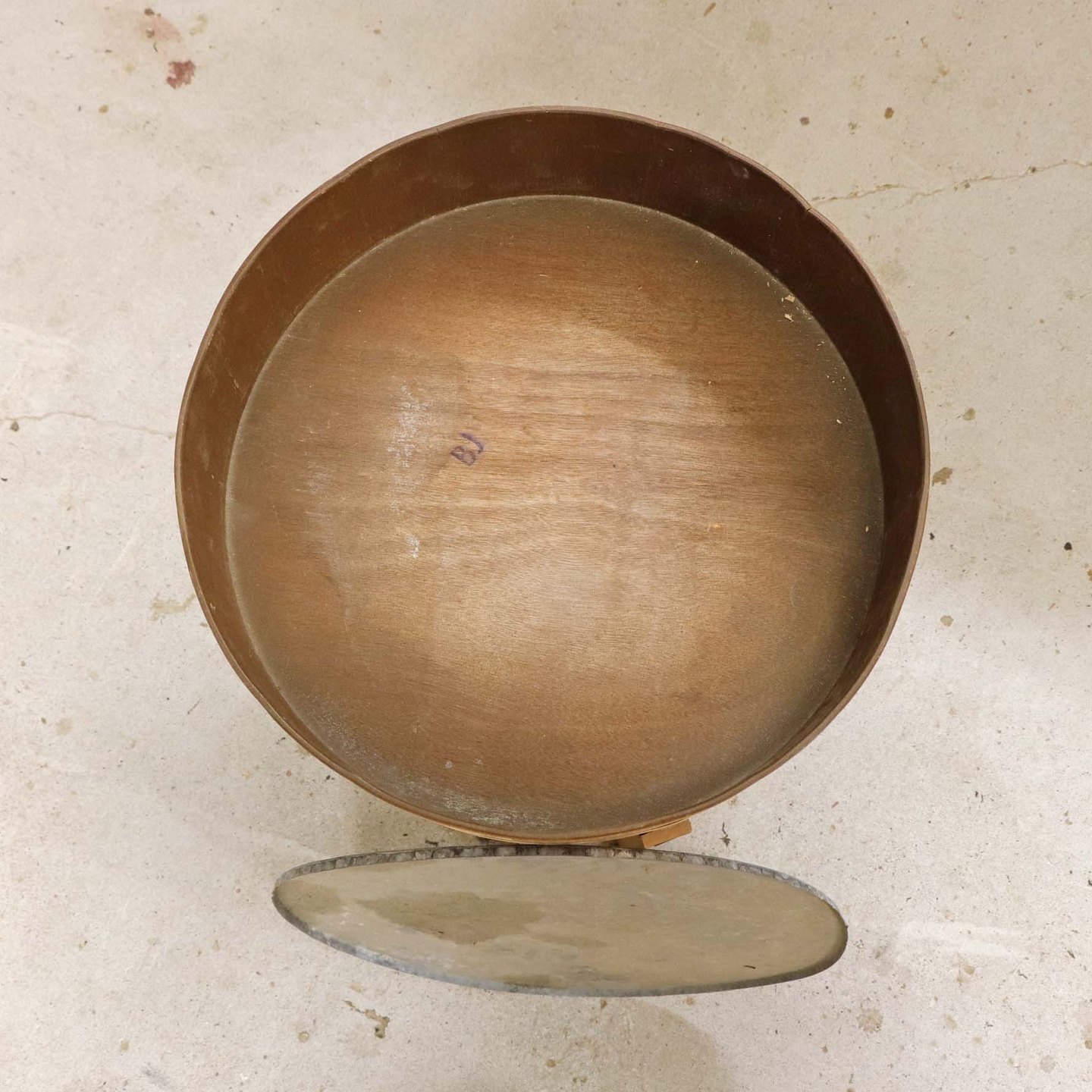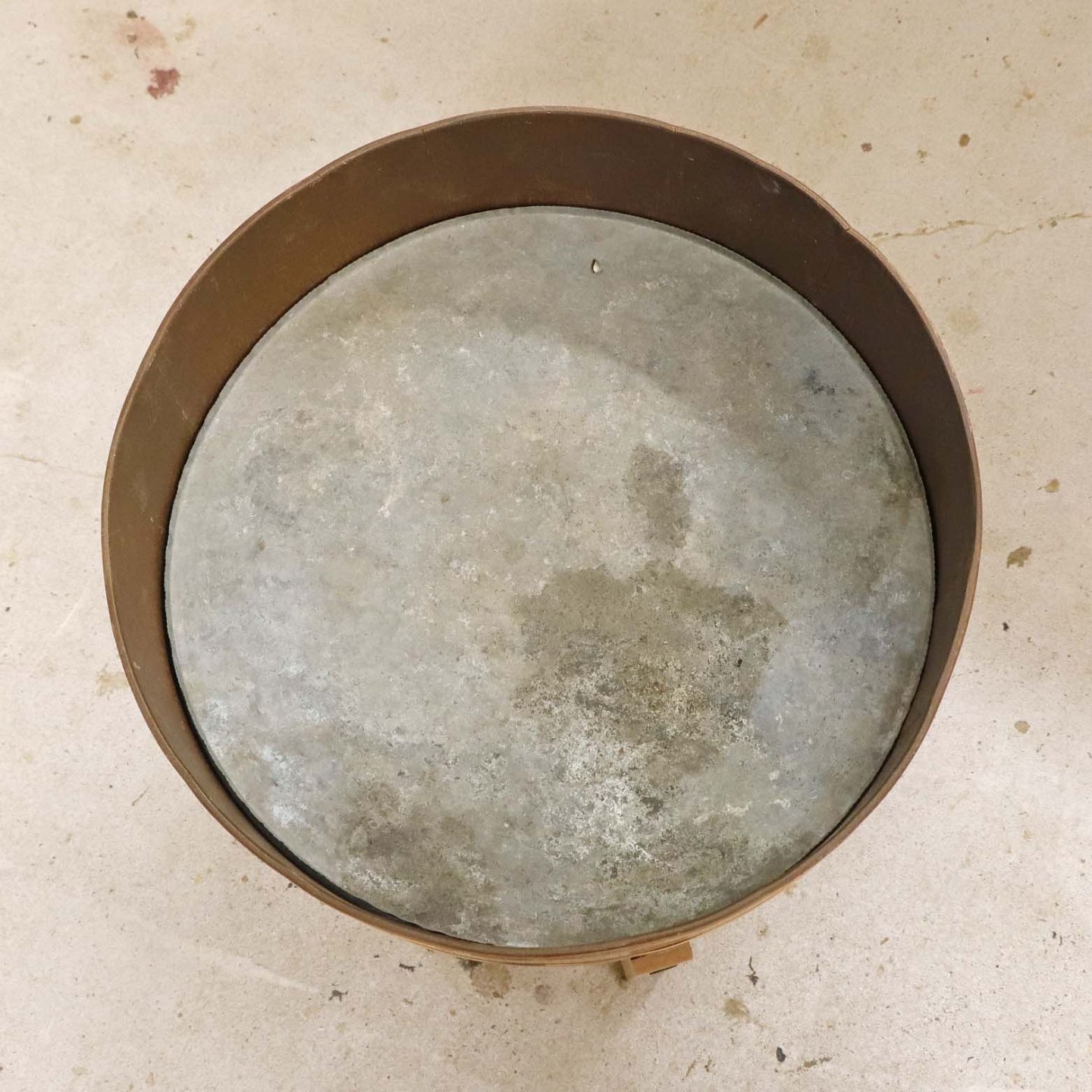 Fremstår med to revner i teaktræsrammen samt brugsspor på zinkplade og rammens yderside samt vandmærker nederst stellet.