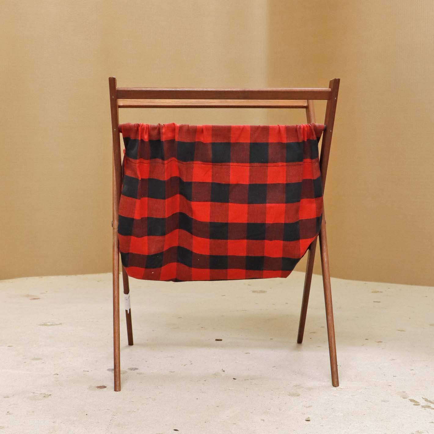 Magasinholder med stel i teaktræ med påmonteret bomuldsstof med mønster af røde og sorte tern. Holderen har to indvendige lommer langs den ene side. Kan også bruges til garn. Holderen kan klappes sammen.