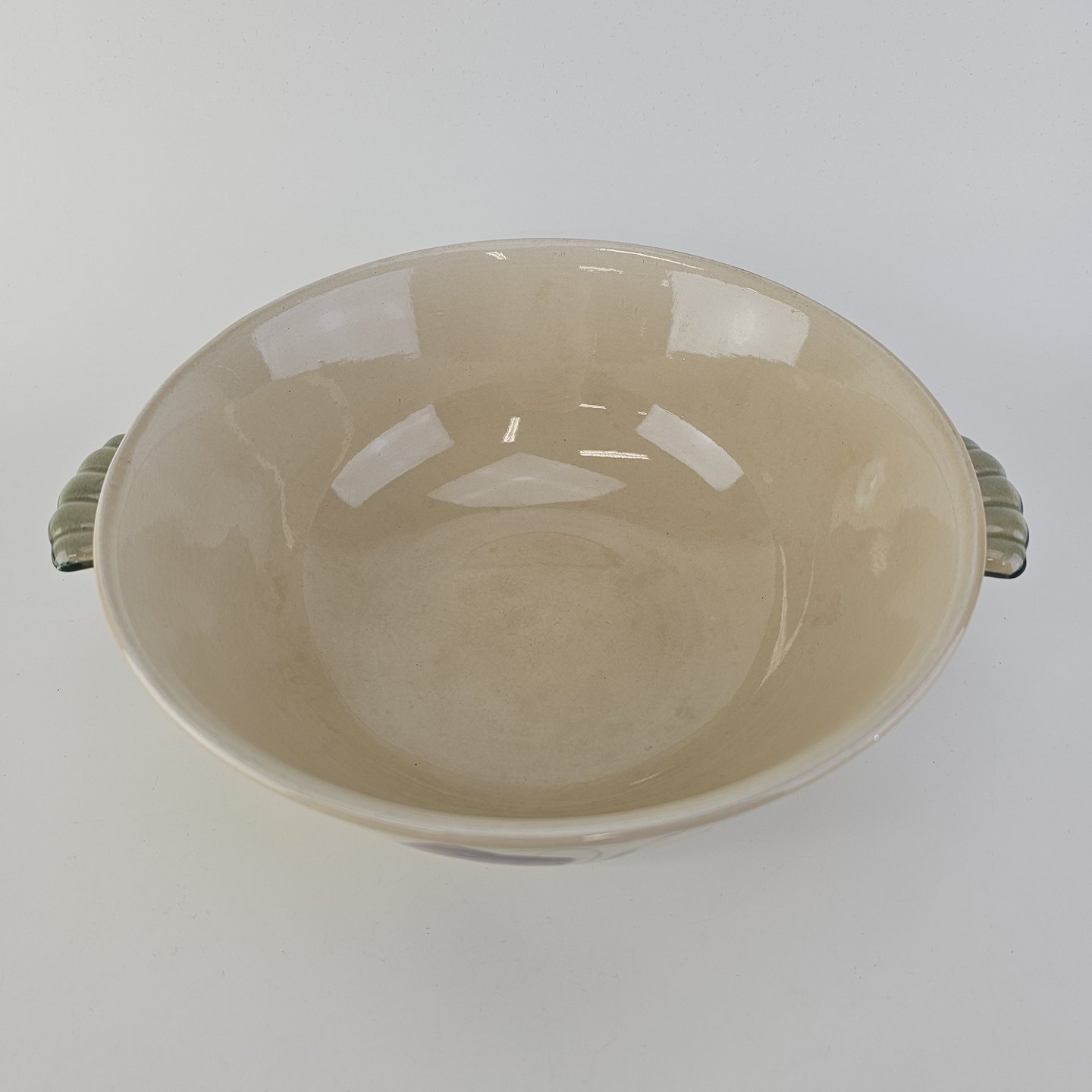 Fajancestel i stelform Viktoria II (Fletværk) med flettet kant og dekoration af en vibeæg blomst i violet og grøn, fremstillet i perioden 1934-1967