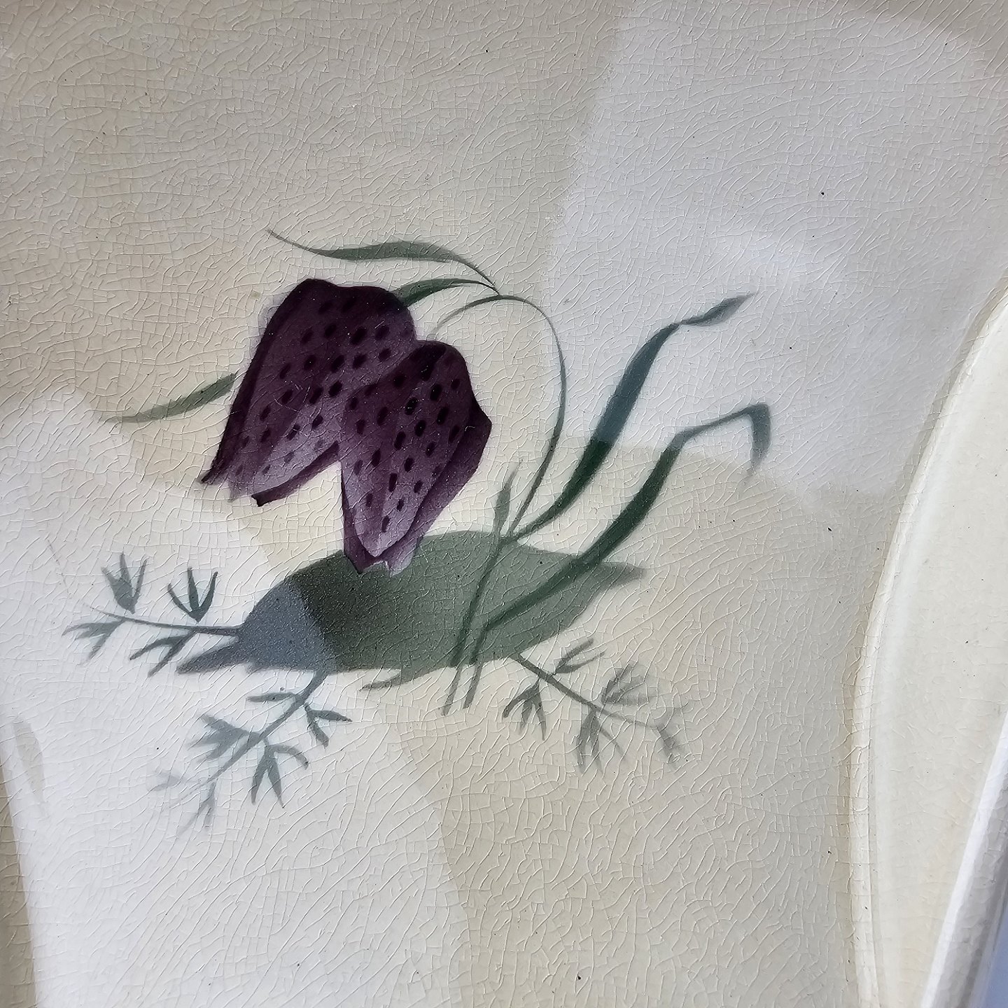 Fajancestel i stelform Viktoria II (Fletværk) med flettet kant og dekoration af en vibeæg blomst i violet og grøn, fremstillet i perioden 1934-1967