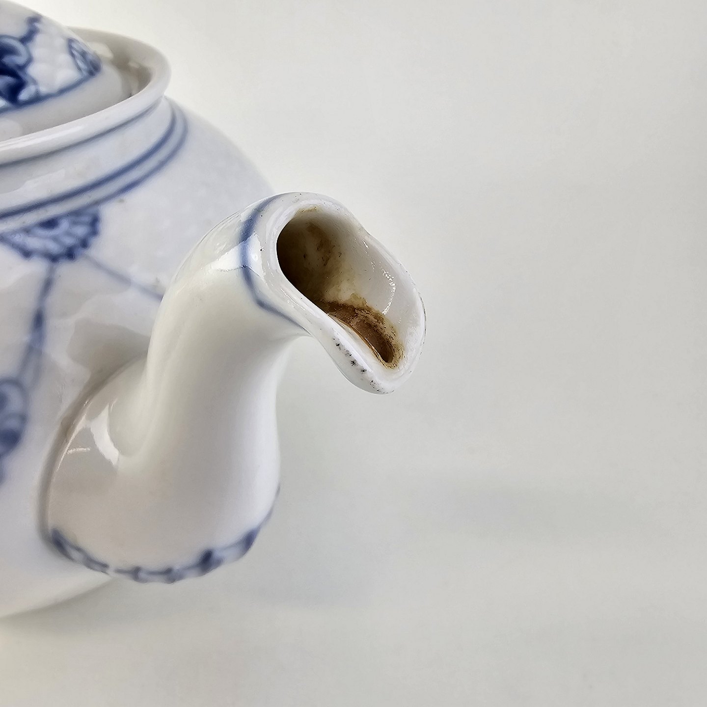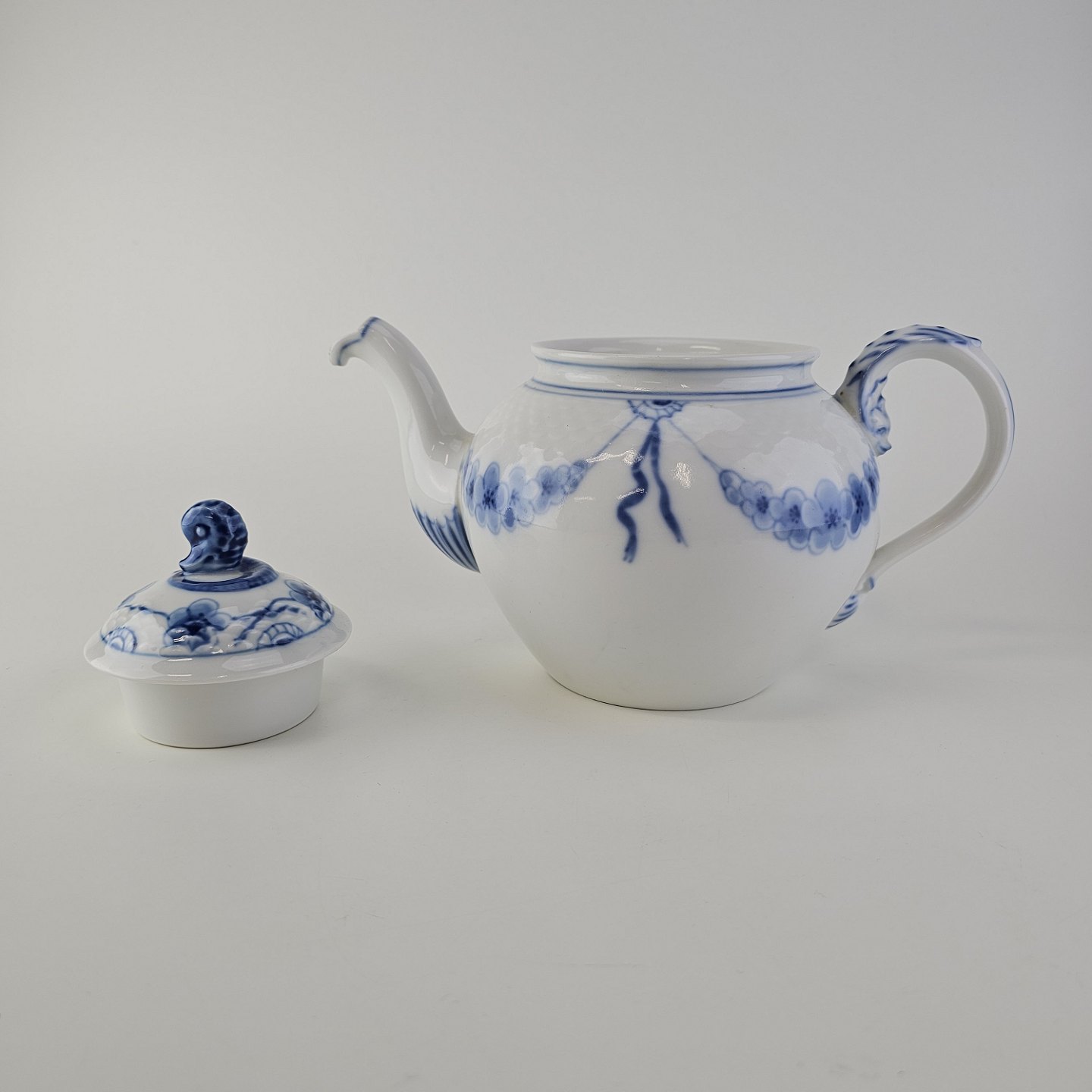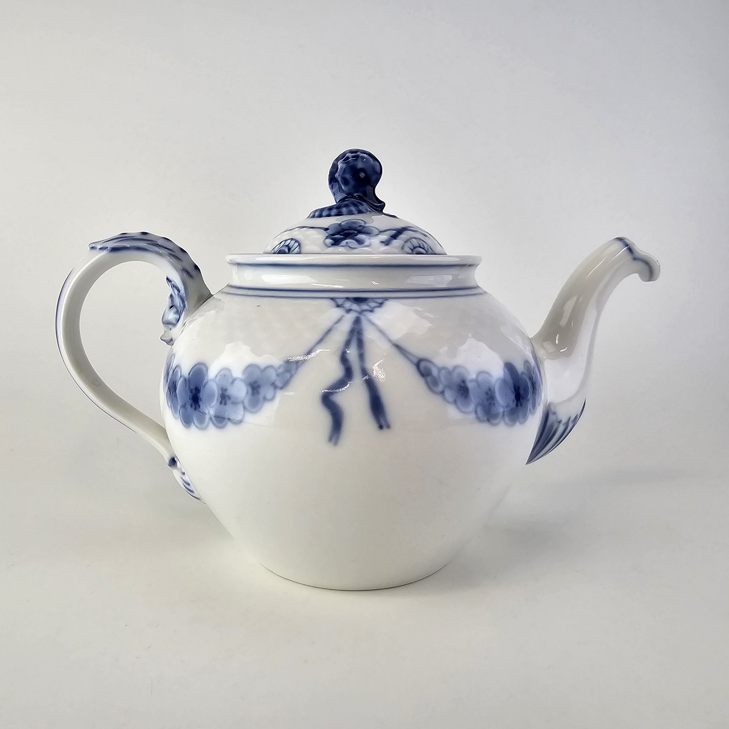 Empire er hvidt porcelæn med skelform og motiv af guirlander med blå blomster