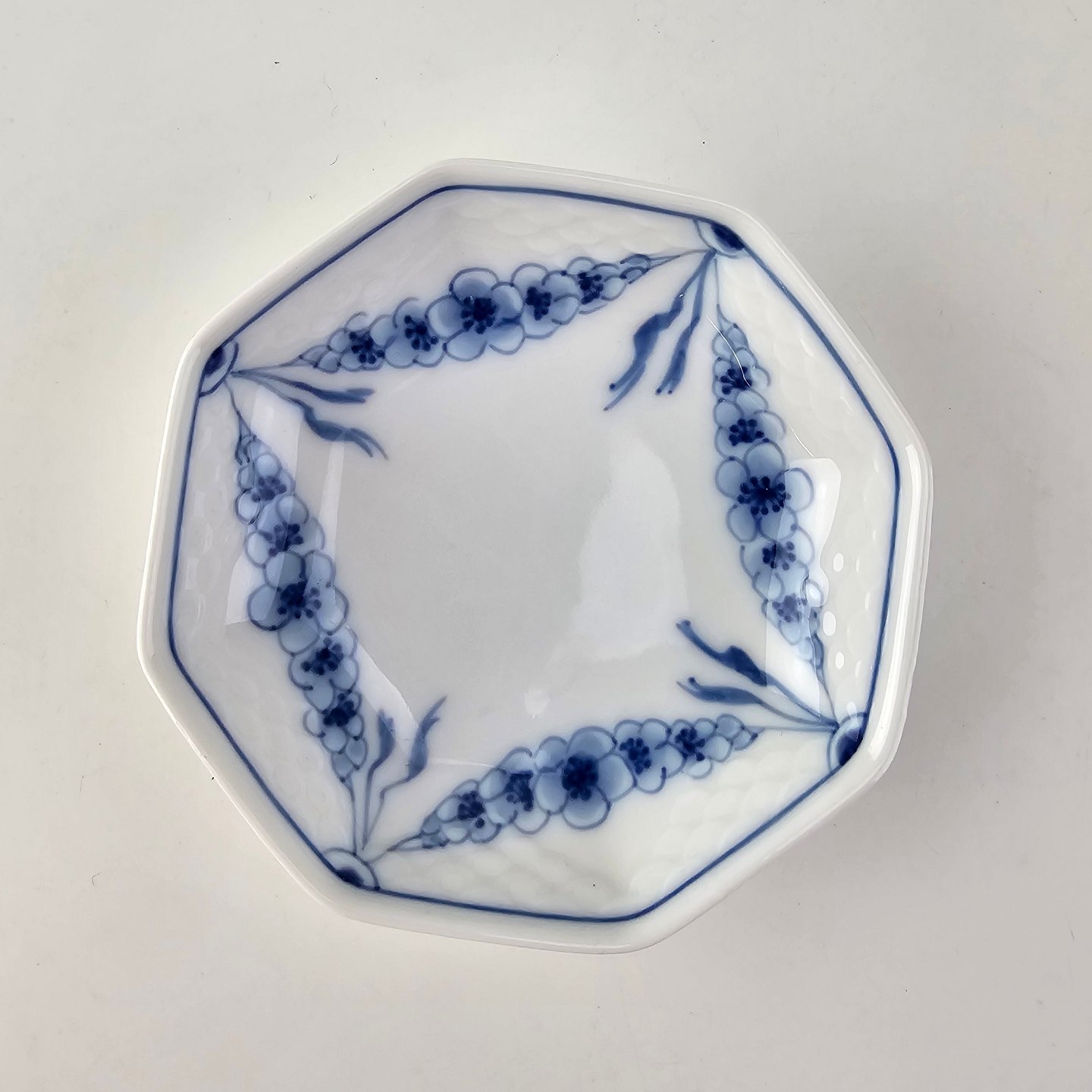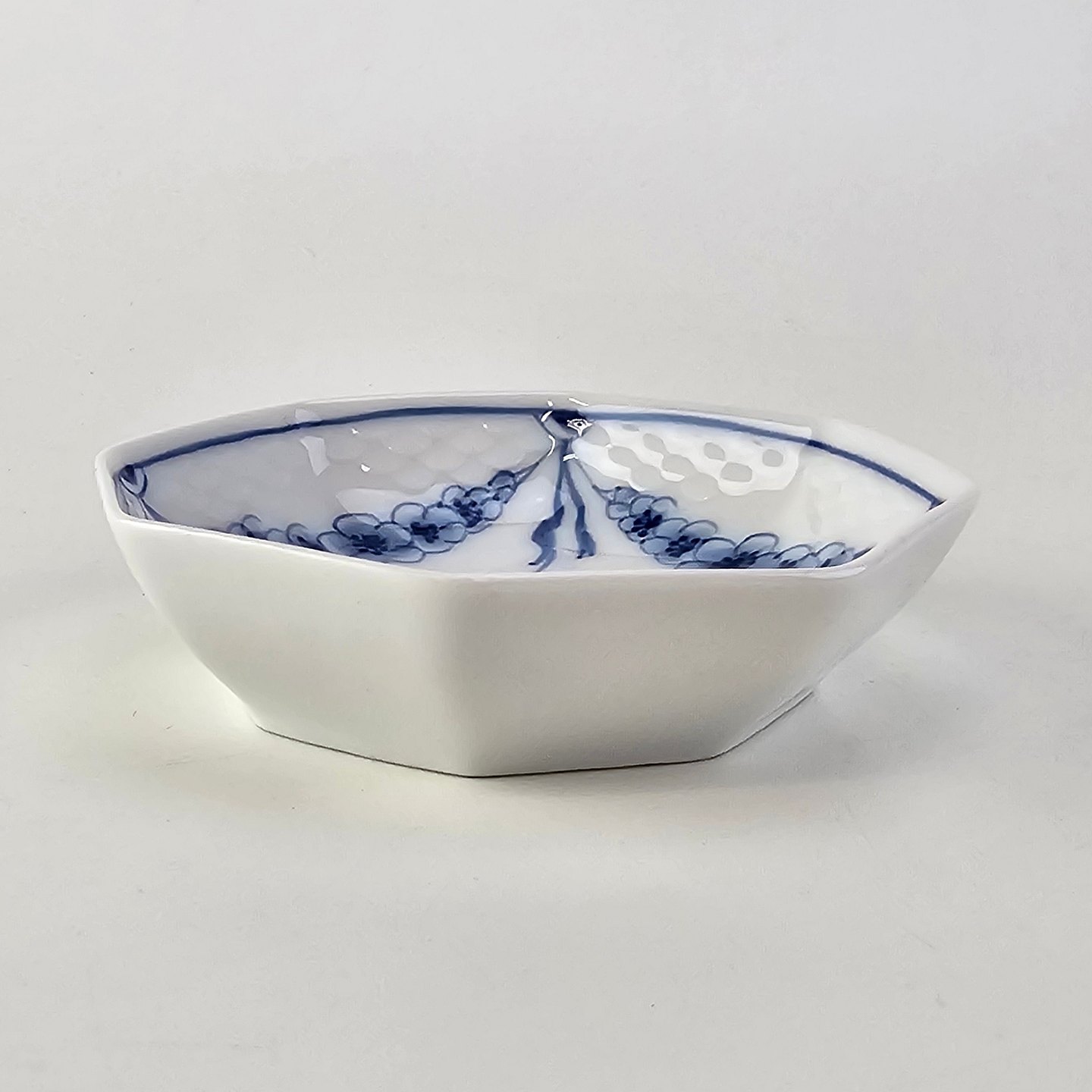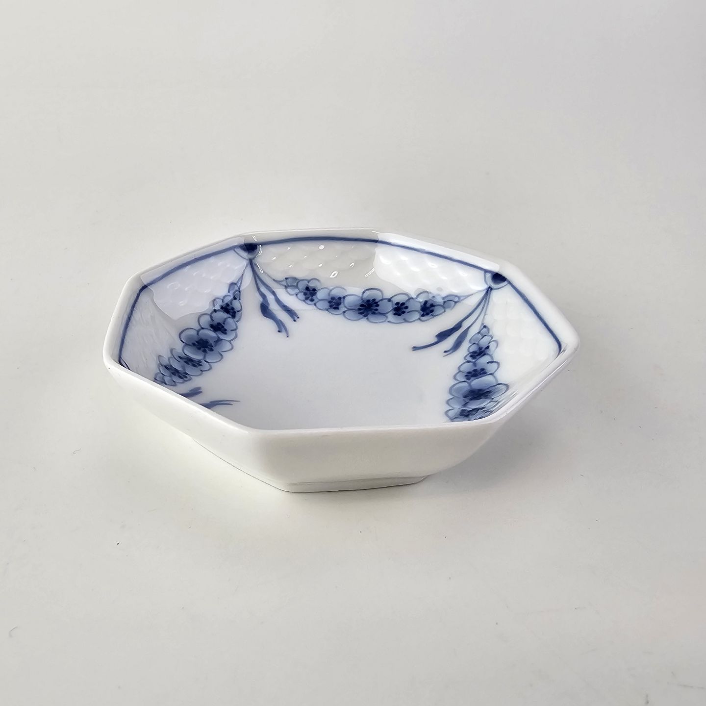 Empire er hvidt porcelæn med skelform og motiv af guirlander med blå blomster